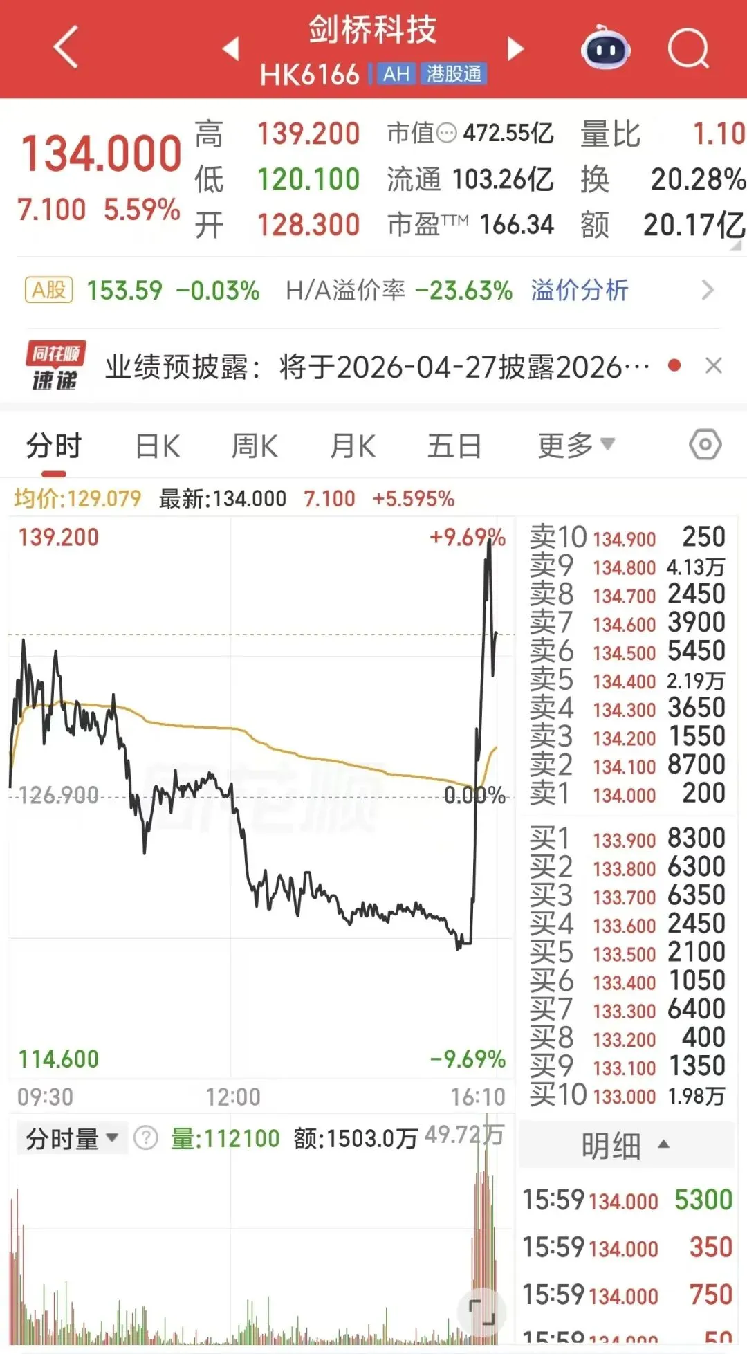 4月27日,剑桥科技港股尾盘拉升涨超5%,此前跌超5%。