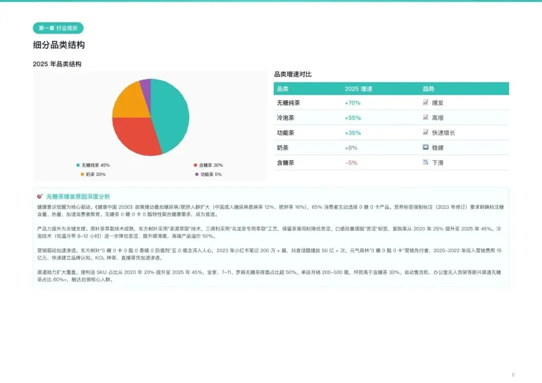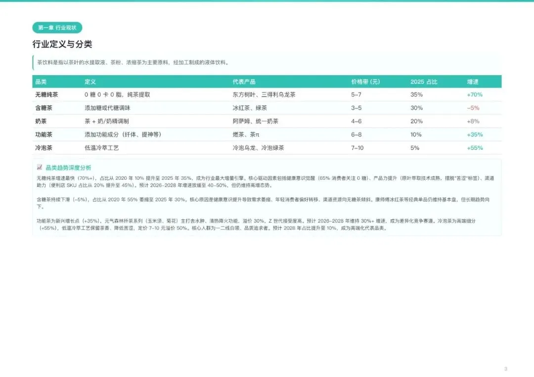 品类分化极为剧烈。无糖纯茶以超70%的增速成为绝对引擎,2025年占比已达35%,预计2026年突破52%,正式成为行业第一大品类。功能茶和冷泡茶分别以35%、55%的增速,占据差异化高端赛道。相比之下,传统含糖茶持续萎缩,占比已从55%跌至30%。