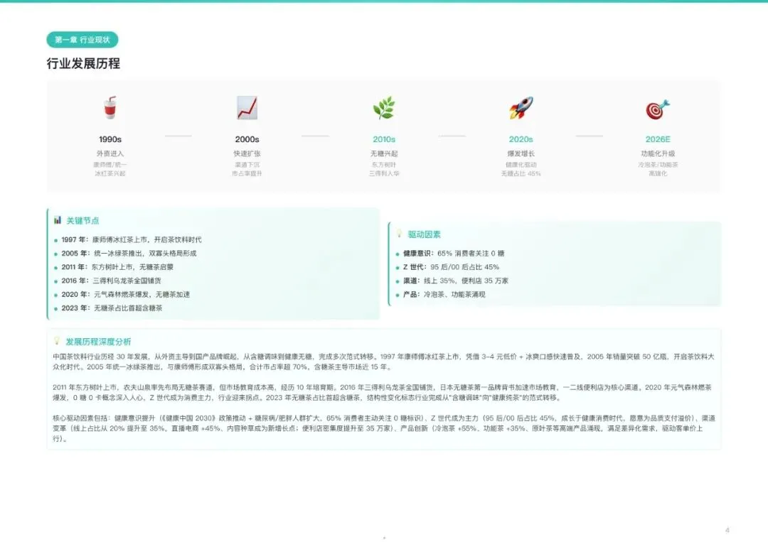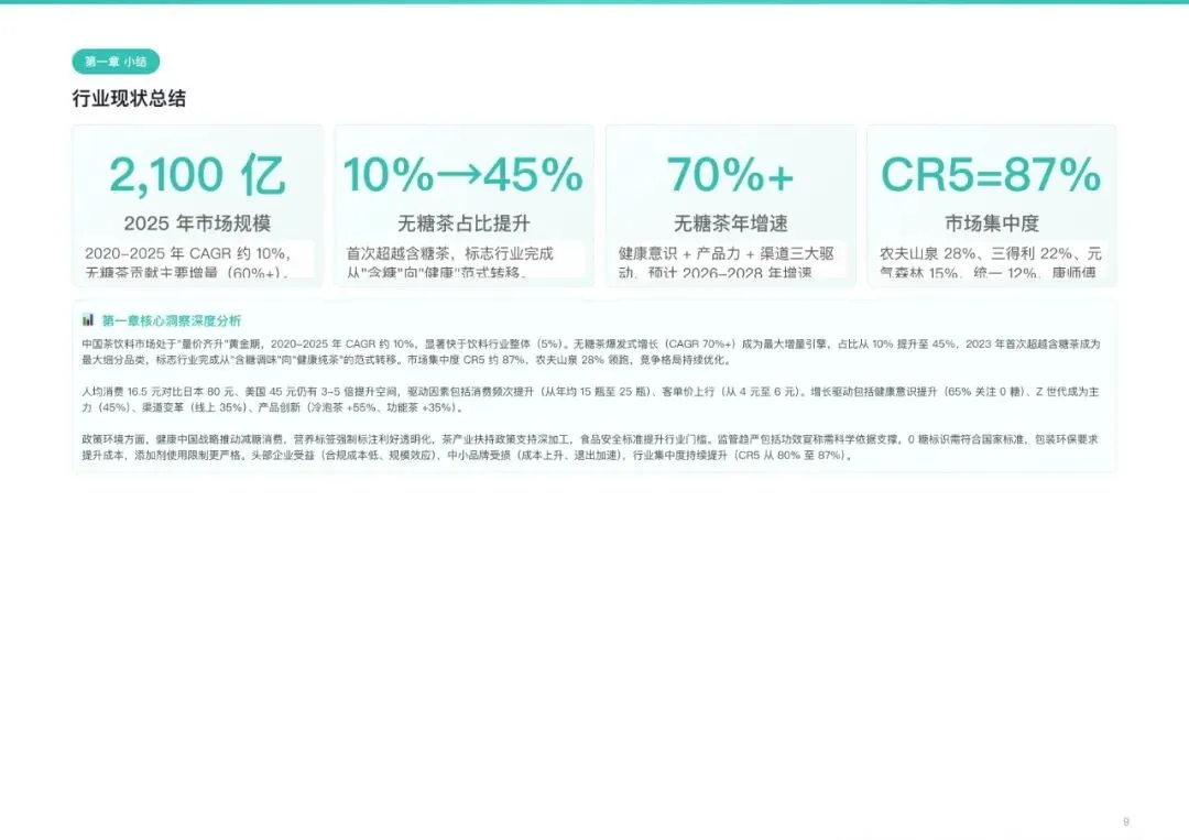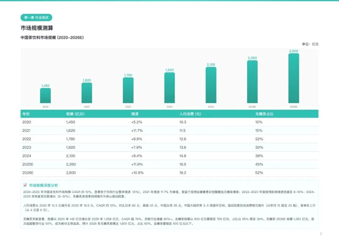 2026年中国茶饮料市场规模预计达2600亿元,近五年复合增长率约10%,显著快于饮料行业整体。市场正经历从含糖调味向健康纯茶的根本性范式转移。