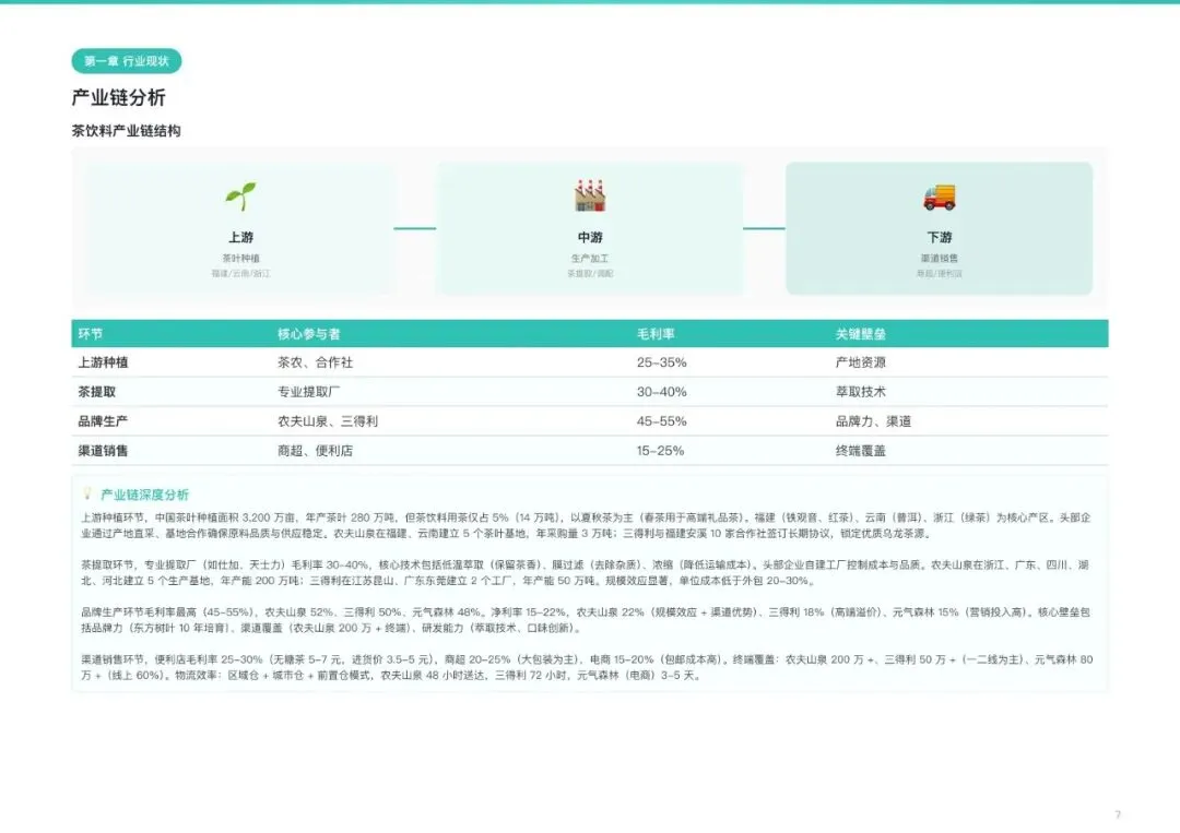 行业高度集中,CR5已达87%,且仍在提升。农夫山泉凭借旗下“东方树叶”十余年的布局,以28%的市占率领跑,其优势在于“五零”健康概念深入人心,以及覆盖全国超200万终端的渠道网络。三得利依托日本品牌的强大背书和扎实的高端品质,稳占22%的份额。元气森林作为新势力代表,凭借“零糖”概念先行和强大的线上营销能力,市占率快速攀升至15%,其功能茶系列尤为突出。