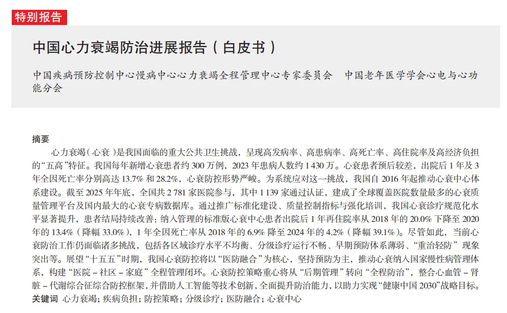 心力衰竭(心衰),作为“心血管病的最后战场”,已成为中国公共卫生领域面临的一项严峻挑战,其患病率持续攀升。2026年4月,《中国心力衰竭防治进展报告(白皮书)》在《中国循环杂志》正式发布。这份报告首次系统性、全景式地揭示了中国心衰的流行现状、防治成效与未来挑战,为“健康中国2030”战略下的心衰防控指明了方向。