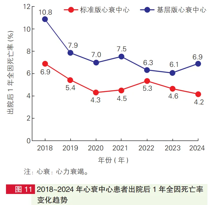 患者结局持续改善:纳入管理的标准版心衰中心患者,出院后1年全因死亡率从2018年的6.9%显著降至2024年的4.2%(降幅39.1%);1年再住院率也明显下降。更可喜的是,基层版心衰中心在关键指标上快速追赶,实现了优质医疗资源的下沉与同质化。