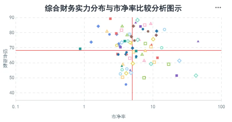 在公司的发展能力、经营稳定性及增长潜力的基础上,结合公司主营业务所属行业的分析、资产结构或资产质量分析、主营业务运营效率分析、受评主体的行业地位分析以及偿付能力的分析做出的公司综合财务实力分析判断。分数越高,公司的综合财务实力越强。处在右下区域的公司,市净率较高且相关指数较低,则存在公司综合财务实力不足的潜在风险。