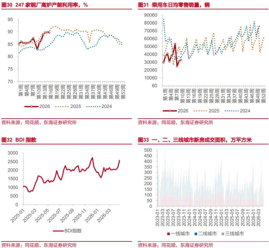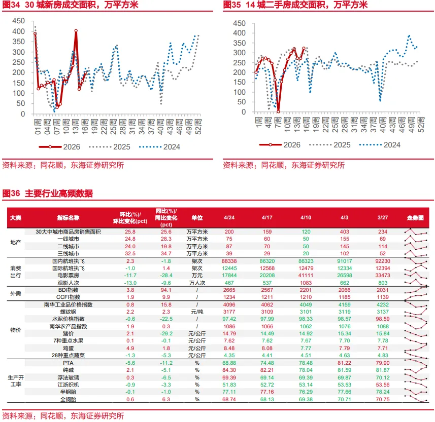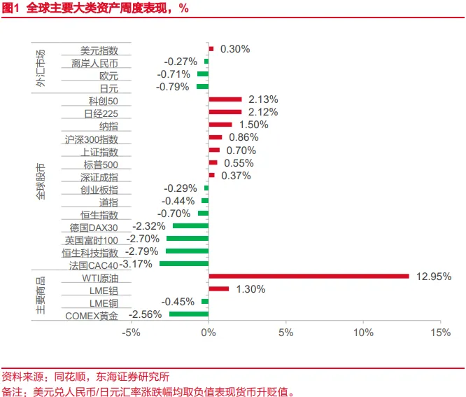 4月24日当周,全球股市涨跌不一,A股、日股领涨;主要商品期货中原油、铝收涨,黄金、铜下跌;美元指数小幅上涨,人民币、欧元、日元贬值。1)权益方面:科创50>日经225>纳指>沪深300指数>上证指数>标普500>深证成指>创业板指>道指>恒生指数>德国DAX30>英国富时100>恒生科技指数>法国CAC40。国内来看,3月广义财政收入增速上升,税收增速贡献明显,这一特征与3月经济整体表现较好相印证,支出端基建方面有所回落,但从一季度整体来看,靠前发力仍然明显,4月特别国债开启发行,后续资金支持力度仍较为可观。海外来看,美国延长停火时限,且美伊双方就是否进行第二轮谈判来拉扯,不过因并未进一步恶化,市场对地缘政治风险短期内存在一定脱敏。凯文·沃什参与美联储主席提名听证会,提出“截尾均值通胀”,为后续上任降息寻找说辞,同时美国司法部撤销对鲍威尔刑事调查,沃什接任的障碍解除,后续市场或逐步关注其降息以及缩表的预期。2)沃什的缩表预期推升美元走强,黄金当周下跌;虽然停火协议延长,但霍尔木兹海峡仍处封锁状态,原油价格当周大幅上涨。3)工业品期货:南华工业品价格指数上涨,螺纹钢、炼焦煤小幅上涨、混凝土、水泥小幅下跌;高炉开工率环比小幅下跌;乘用车截至4月24日当周销量3.30万辆,环比5.12%,同比-26.00%;BDI环比上涨3.82%。4)国内利率债收益率收跌,全周中债1Y国债收益率下跌1.75BP至1.1438%,10Y国债收益率下跌0.22BP收至1.7601%。5)2Y美债收益率当周上涨7BP至3.78%,10Y美债收益率上涨5BP至4.31%;10Y日债收益率上行0.1BP至2.4290%。6)美元指数收于98.53,周上涨0.3%;离岸人民币对美元贬值0.27%;日元对美元贬值0.79%。