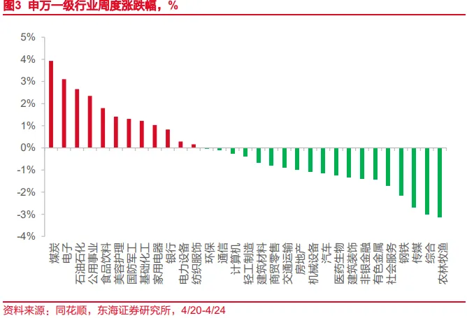 国内权益市场。4月24日当周,风格方面,成长>消费>周期>金融,日均成交额为26004亿元(前值23452亿元)。申万一级行业中,共有12个行业上涨,19个行业下跌。其中,涨幅靠前的行业为煤炭(+3.93%)、电子(+3.11%)、石油石化(+2.66%);跌幅靠前的行业为农林牧渔(-3.15%)、综合(-3.00%)、传媒(-2.69%)。