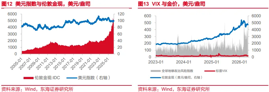美伊战争走向预期反复,周内金价震荡下行。截至2026年4月24日当周,金价震荡上行,在周五收于4708.62美元/盎司,较上周同期下跌2.66%。美国三大股指周内偏弱上行,美元指数维持在99点下方。3月我国央行继续增持黄金储备16万盎司。美国3月零售销售环比增长1.7%,创一年多来最大涨幅。市场预期美联储下次降息时间推迟至明年10月,押注降息25个基点。SPDR持有量基本持平,中日矛盾、美国贸易协定、俄乌冲突等仍存在较大不确定性。长期来看,美元及美债的避险属性被削弱,黄金避险需求凸显,美元长期贬值预期较强,黄金长期上涨逻辑坚挺。