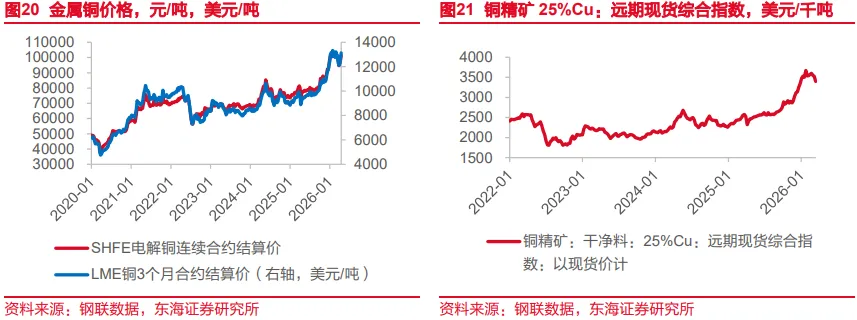 2026年,金属精炼铜价格震荡上行,4月24日当周,SHFE电解铜连续合约结算平均价格为102516元/吨,较上一周环比上升1.2%,价格与去年同比增长32.3%;LME伦铜3个月合约结算价为13269.8美元/吨。4月24日当周,我国铜精矿干净料(25%Cu)远期现货综合价格指数约为3599美元/干吨,价格环比下降1.7%。SHFE和LME电解铜均价较上周回升主要受宏观情绪回暖、美元走弱、供应端收缩、库存低位及需求旺季共同推动。中东地缘缓和与美国通胀数据低于预期提振美联储降息预期,美元指数下行支撑铜价;冶炼厂集中检修、原料采购需求走弱,叠加矿端供应宽松、现货TC低位企稳回升,铜精矿价格下行。