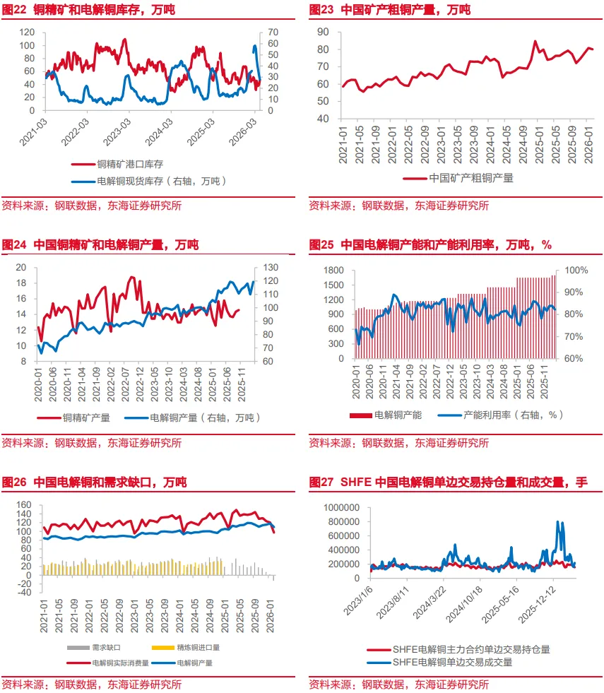 2026年3月,我国电解铜产量约为119.37万吨,环比上升8.5%,同比增幅5.7%,生产能力复苏较上期回暖。2026年3月,我国电解铜年化平均产能为1698万吨,产能利用率为82.29%。2026年2月我国电解铜产量和需求缺口约为-12.62万吨,近年来产量首次超过实际消费量。我国进口电解精炼铜总量基本可以覆盖生产需求缺口。