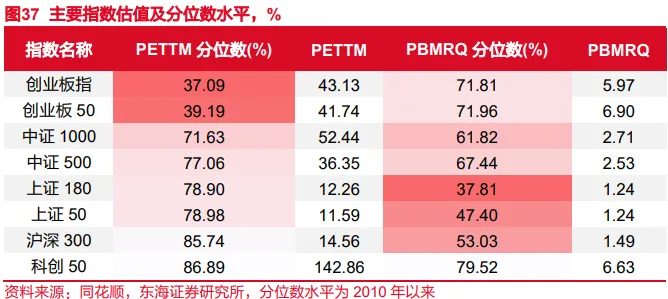 主要指数估值(PE)分位数水平:创业板指<创业板50<中证1000<中证500<上证180<上证50<沪深300<科创50。