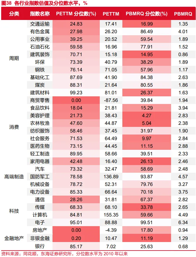 主要行业估值(PE)分位数水平:周期:交通运输<有色金属<公用事业。消费:商贸零售<食品饮料<美容护理。高端制造:家用电器<汽车<国防军工。科技:通信<传媒<计算机。金融(PB):房地产<非银金融<银行。