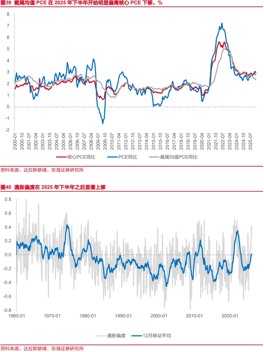 截尾均值通胀是什么?截尾均值通胀(trimmed mean inflation)是剔除当月涨跌幅度最大的商品服务价格后形成的通胀指标。克利夫兰联储发布的截尾均值CPI选择截去双端16%的尾部风险(左右端分别为8%)并对后续剩余通胀分项进行加权平均,最终得到16%截尾均值CPI数据。市场运用较多的是达拉斯联储编制的不对称截尾均值PCE(如:当通胀分布偏度为正数时,右尾更长,则右端截去比例更大;负偏度则反之),其在2025年下半年后较核心PCE的差值在持续走阔。截至2026年2月,截尾均值PCE下落至2.33%,明显低于当月核心PCE数据2.97%。由于美联储主要以PCE作为货币政策的主要判断依据,故本文后续以达拉斯联储发布的截尾均值PCE作为主要讨论内容。?