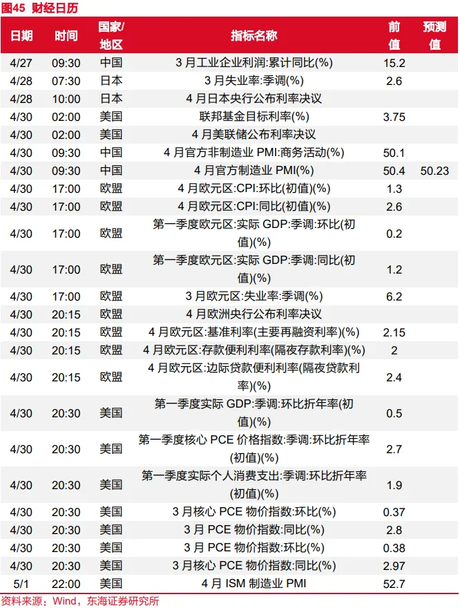 3)新的一周主要经济数据与市场预期。新的一周A股将迎来2025年报及2026年一季报的业绩披露最集中的日期。对于全球经济而言,除继续关注地缘政治对油价影响外,主要发达经济体如美国、加拿大、欧元区、日本和英国,以及巴西和墨西哥等将召开央行政策会议,加上GDP、PMI和关键通胀数据,经济数据将会繁忙。在美国,美联储预计将维持联邦基金利率在3.50-3.75%不变,在经济方面,第一季度GDP预估增长将较去年四季度数据大幅回升;美国其他数据包括房屋开工、建筑许可、Case-Shiller房价、ISM制造业PMI、耐用品订单、外贸和批发库存预估以及第一季度就业成本指数等。在欧洲,外界普遍预计,欧洲央行和英国央行都将在即将召开的会议上维持利率不变;欧元区4月份的通胀率预计将升至2.9%,为2023年12月以来的最高水平,主要受能源成本的推动;在增长方面,预计第一季度GDP预计将显示整个欧元区的温和扩张。在中国,将关注官方和非官方PMI调查,以及工业企业利润数据。在日本,市场普遍预计央行将维持基准利率在0.75%不变,主要的经济数据包括失业率,预计将稳定在2.6%;此外,消费者信心可能会小幅下降,而东京的核心通胀率预计将升至1.8%。