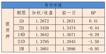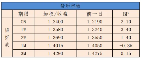 今日银行间市场主要回购利率整体下行。隔夜加权平均利率收盘于1.2672%,上日的收盘价为1.2631%,上行0.41BP;14天收盘价为1.3642%,相比较昨天的收盘价格1.3671%,下行0.29BP。