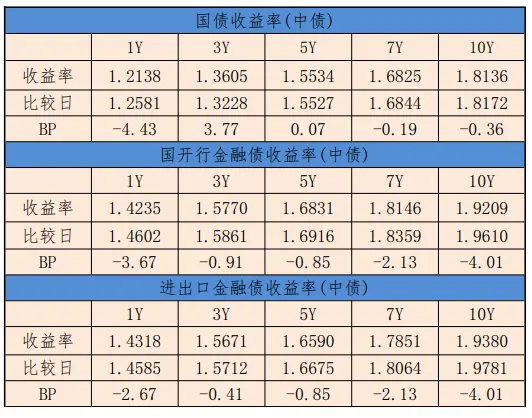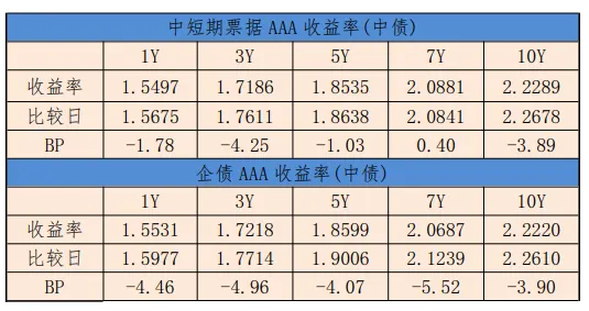 中债中短期票据收益率曲线(AAA)1年期收益率下行1.78BP,至1.5497%,3年期收益率下行4.25BP,至1.7186%。