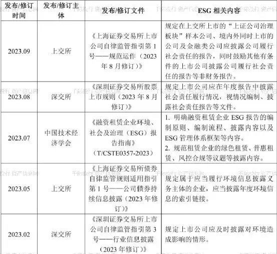 2026-2028年,融资租赁行业的确定性投资机会主要集中在绿色租赁与跨境租赁两大领域。绿色租赁聚焦光伏、储能设备、环保设备等领域,契合国家“双碳”战略导向,具备政策支持与长期发展潜力;跨境租赁则围绕国产装备出海需求,为出口设备提供融资租赁服务,助力国产高端装备走向国际市场,同时依托跨境业务拓宽机构业务边界,提升国际化服务能力。近几年发布/修订关键的ESG规范文件:
