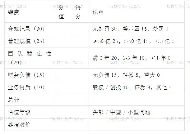 1.合规洁净(30)2. 资产质量(25)3. 产业场景(20)4. 盈利稳定(15)5. 区域牌照(10)