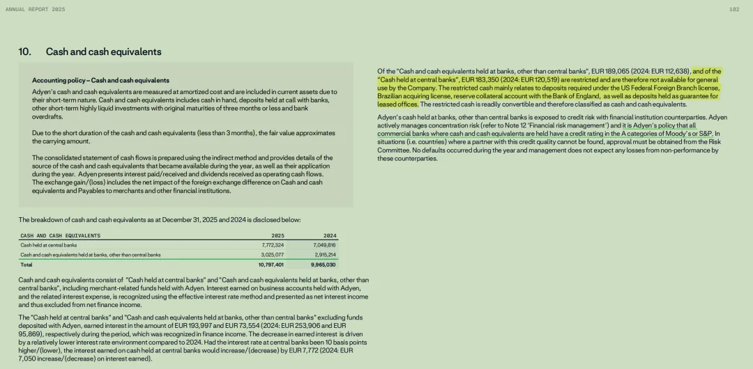 不可动用金额,主要是因为:美国联邦分支机构牌照的存款要求,巴西收单行的要求,英格兰银行储备抵扣账户的要求租赁担保资金:在欧洲和美国,顶级商办楼的租约通常需要大额的现金质押作为担保。这部分钱虽然在 Adyen 名下,但在租约结束前是不可动用的。