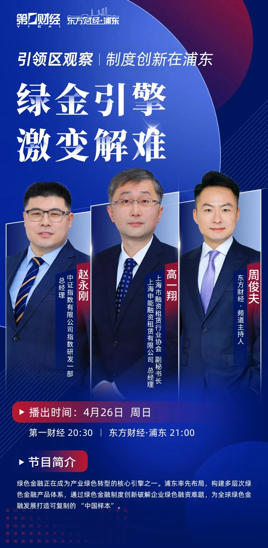 绿色金融正在成为产业绿色转型的核心引擎之一。浦东率先布局,构建多层次绿色金融产品体系,通过绿色金融制度创新破解企业绿色融资难题,为全球绿色金融发展打造可复制的 “中国样本”。4月26日第一财经和东方财经联合制作播出《绿金引擎,激变解难》访谈,聚焦浦东新区ESG 绿色金融、融资租赁等方面具有代表性的制度创新案例,生动呈现浦东如何以制度创新激活发展动能。