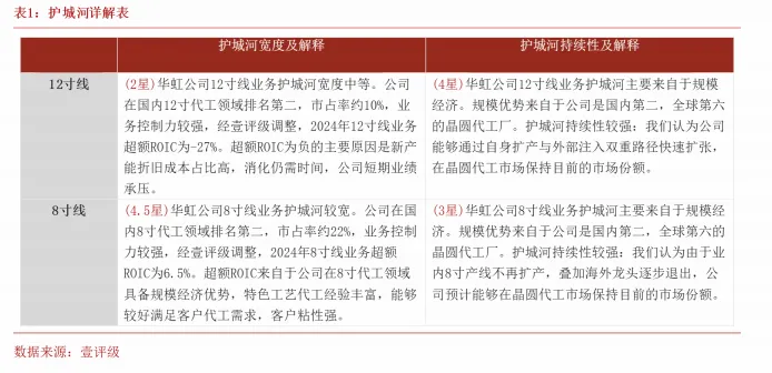 华虹公司护城河较深。12寸线护城河源于其国内第二、全球第六的规模地位,虽受新产能高折旧影响短期超额ROIC为负,但具备持续扩张能力以稳固份额;8寸线则凭借约22%的国内市占率、成熟的特色工艺和强客户粘性,实现正向超额ROIC。受益于行业不再新增8寸产能及海外厂商退出,其护城河有望长期维持。