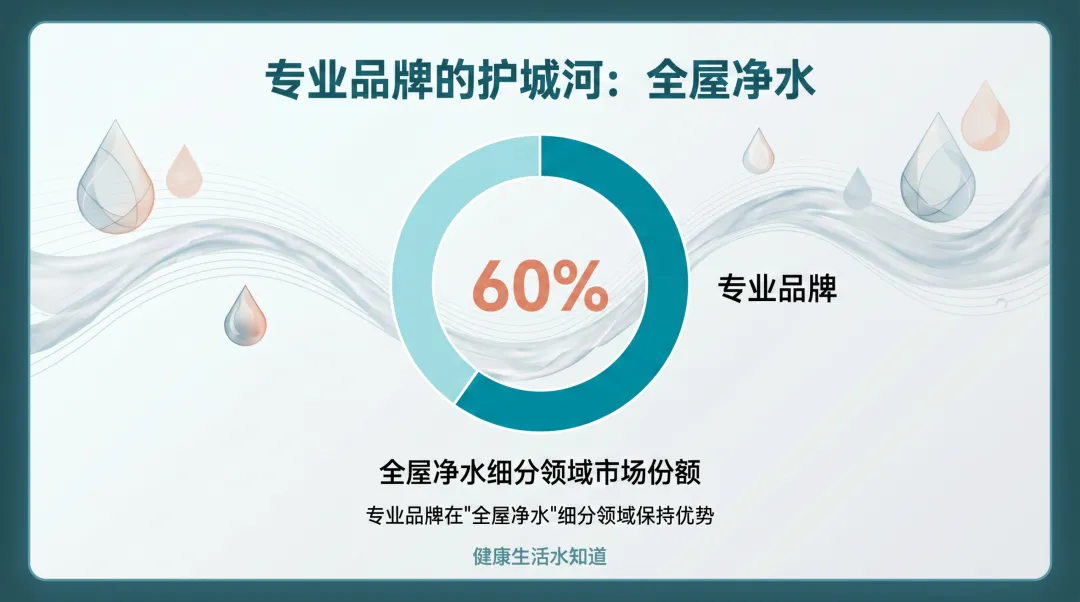 在"全屋净水"这一细分领域,有品牌占据了约60%的市场份额。这说明在高端、重服务的场景下,专业品牌仍有不可替代的价值。