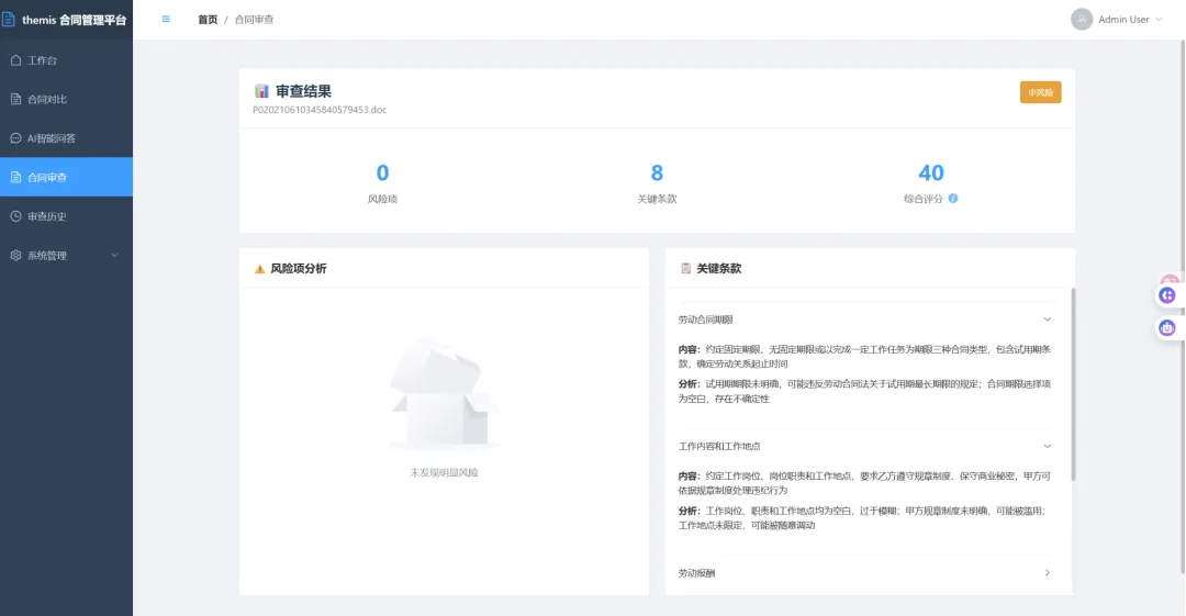 ? 智能化: 基于大语言模型的智能合同审查,自动识别风险条款 ? 知识驱动: RAG技术结合法律知识库,提供专业法律建议 ? 智能体: ReAct Agent支持工具调用,处理复杂法律分析任务 ? 可视化: 直观的风险分析和报告生成 ? 安全可靠: 完善的权限管理和数据安全保障