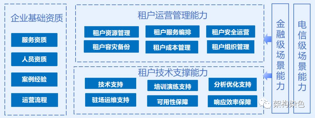 面向金融、电信、央国企等行业云平台运营方,从企业基础资质、租户运营管理能力、租户技术支撑能力三个维度,对行业云平台运营能力进行考察。