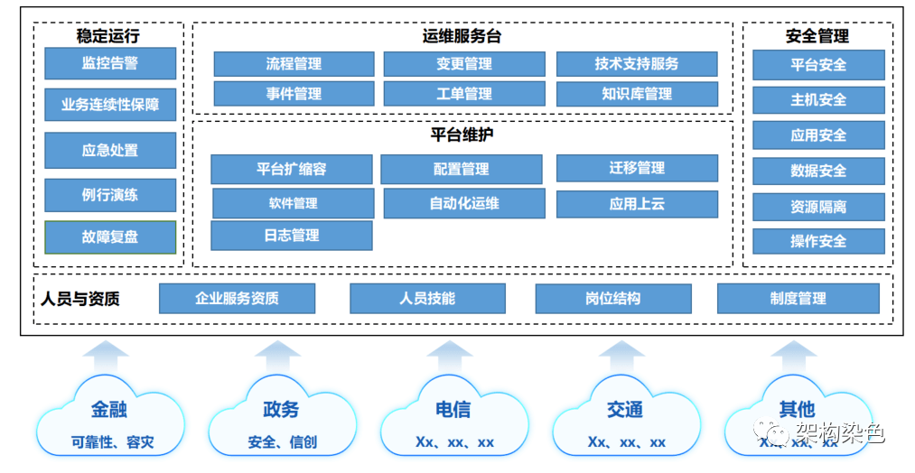 面向行业云平台运维方,从人员与资质、平台维护、运维服务台、稳定运行、安全管理五个能力域,28 个能力子项,207 个能力指标对行业云平台运维方平台运维能力成熟度进行考察。同时,为满足不同行业场景下的行业云平台运维能力要求,本标准还包含金融、政务、电信、交通等行业云平台运维能力的场景化能力指标。