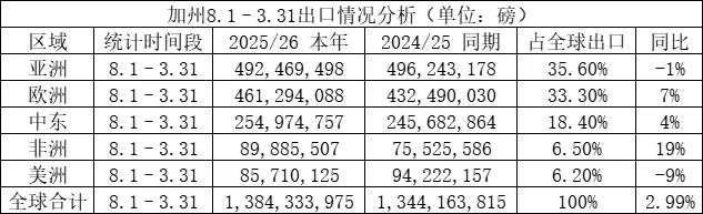 期初库存:4.84亿磅,同比-3.75% 新季收货量:30.00亿磅,同比-0.60% 扣除2%损耗后可售:29.40亿磅 总供应量:34.24亿磅,同比-1.11%