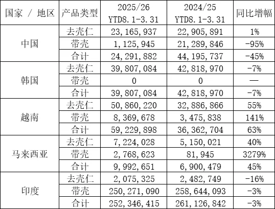印度:带壳进口量巨大,稳居第一大目的地 越南:同比 + 63%,增速亮眼