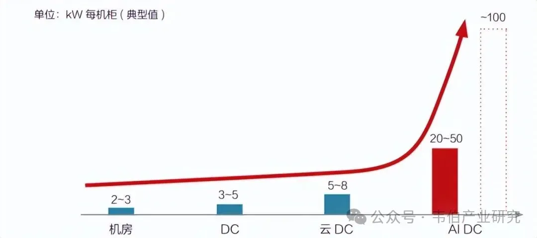 算力密度增长驱使功率密度急剧增长,AIDC耗电量激增。传统数据中心单机柜功率密度通常为3-8KW,AI技术发展下算力需求指数级增加,单机柜功率密度将提高至20-100KW,导致数据中心用电量飙升,单个数据中心用电量将跃升至200MW、乃至500MW以上。