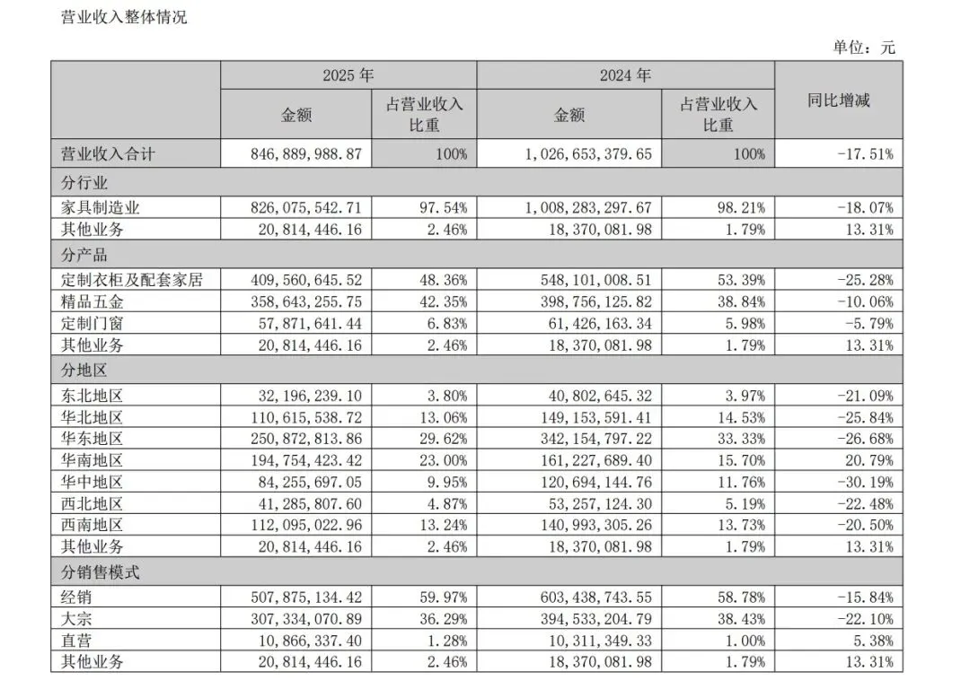 顶固集创发布2025年财报及一季报4月26日,顶固集创2025年年报显示,2025年公司主营收入8.47亿元,同比下降17.51%;归母净利润891.06万元,同比上升105.09%;扣非净利润-1322.02万元,同比上升92.79%。值得注意的是,2025年第四季度,公司单季度主营收入1.58亿元,同比下降31.41%;单季度归母净利润-280.88万元,同比上升98.3%。顶固集创表示,面对地产后周期与行业竞争加剧的外部压力,公司以“内生固本+外延拓新”双轮驱动作为发展战略:一方面深耕定制家居主业,持续夯实经营基本盘;另一方面积极布局商业航天、军工电子等高景气赛道,全力打造第二增长曲线。具体来看,定制衣柜及配套家居实现营收4.09亿元,占营收比重48.36%,同比下滑25.28%。五金直聘营收3.59亿元,占营收比重42.35%;门窗产品营收5787.1万,占营收比重6.83%。其他产品营收2081万元。从销售模式来看,经销商仍然为公司主要经营渠道,经销商实现营收5.08亿元,占营收比重59.97%,大宗业务营收3.07亿元,直营业务1086.7万元,其他2081万。4月26日晚,“中国功能五金第一股”悍高集团披露2025年度报告,2025年,公司实现营业收入35.95亿元,同比增长25.83%;归属于上市公司股东的净利润7.04亿元,同比增长32.39%。分板块看,收纳五金实现销售收入10.42亿元,同比增长21.59%;基础五金实现销售收入16.79亿元,同比增长37.18%,成为增长核心引擎;厨卫五金实现销售收入4.48亿元,同比增长23.92%;户外家具实现营收2.42亿元。悍高集团4月27日发布2026年一季报显示,公司一季度实现营业收入7.05亿元,同比增长12.54%;归母净利润1.29亿元,同比增长11.19%。