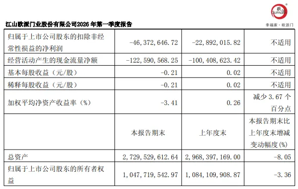 江山欧派2026年一季报显示,一季度公司主营收入2.28亿元,同比下降43.35%;归母净利润-3636.16万元,同比下降1150.66%;扣非净利润-4637.26万元,同比下降102.57%;负债率61.62%,财务费用845.99万元,毛利率14.9%。