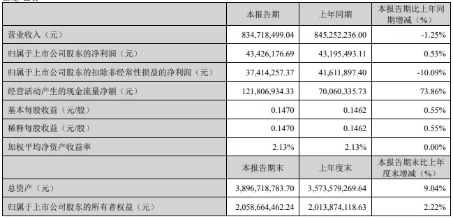南兴股份公告,2026年第一季度营业收入8.35亿元,同比下降1.25%。净利润4342.62万元,同比增长0.53%。扣除非经常性损益后的净利润3741.43万元,同比下降10.09%。
