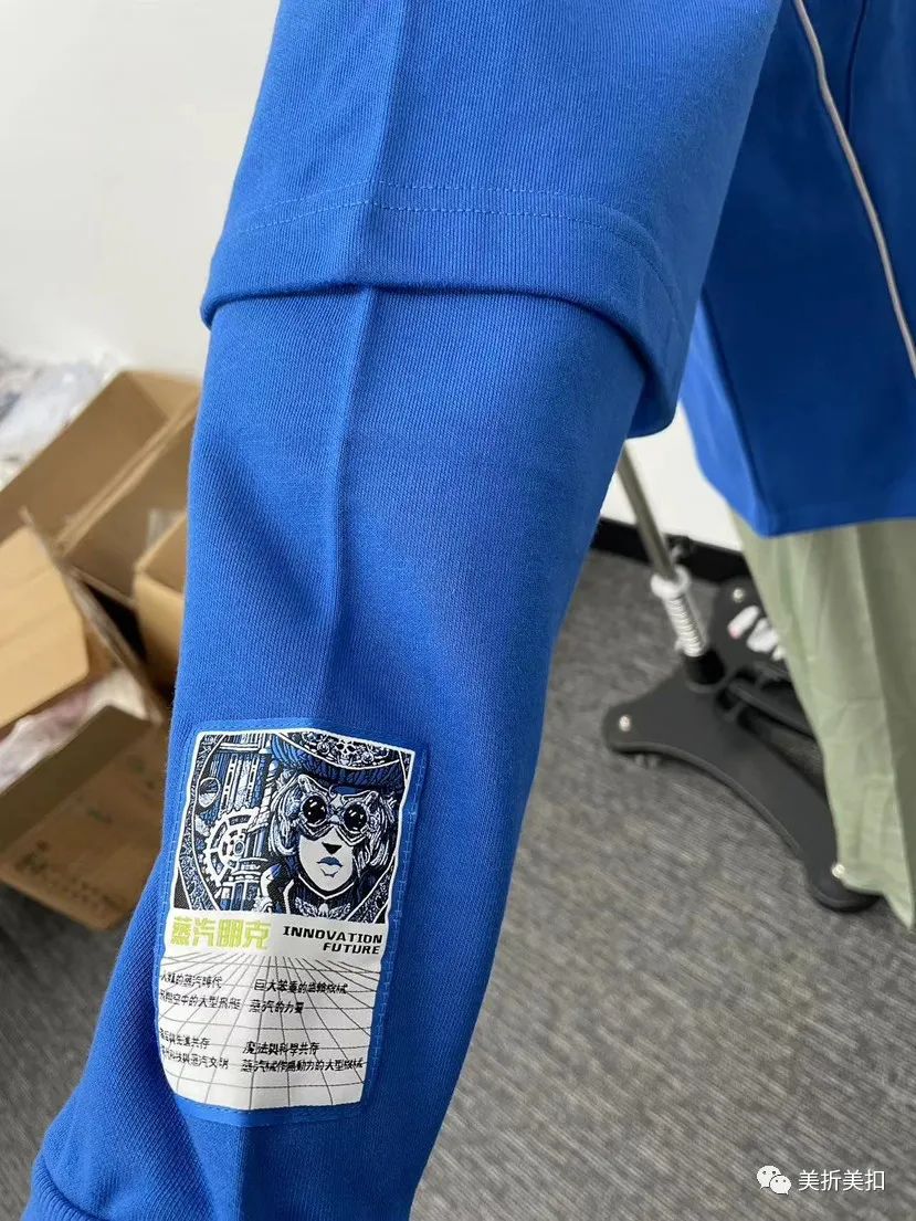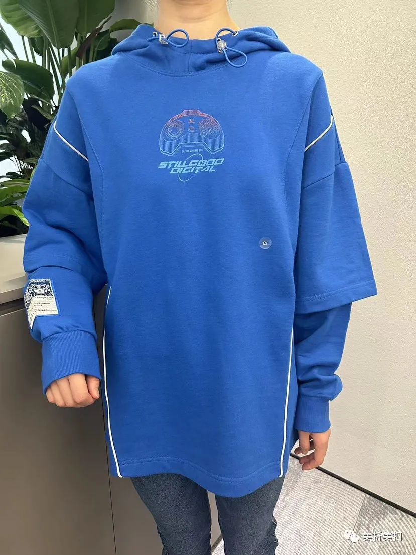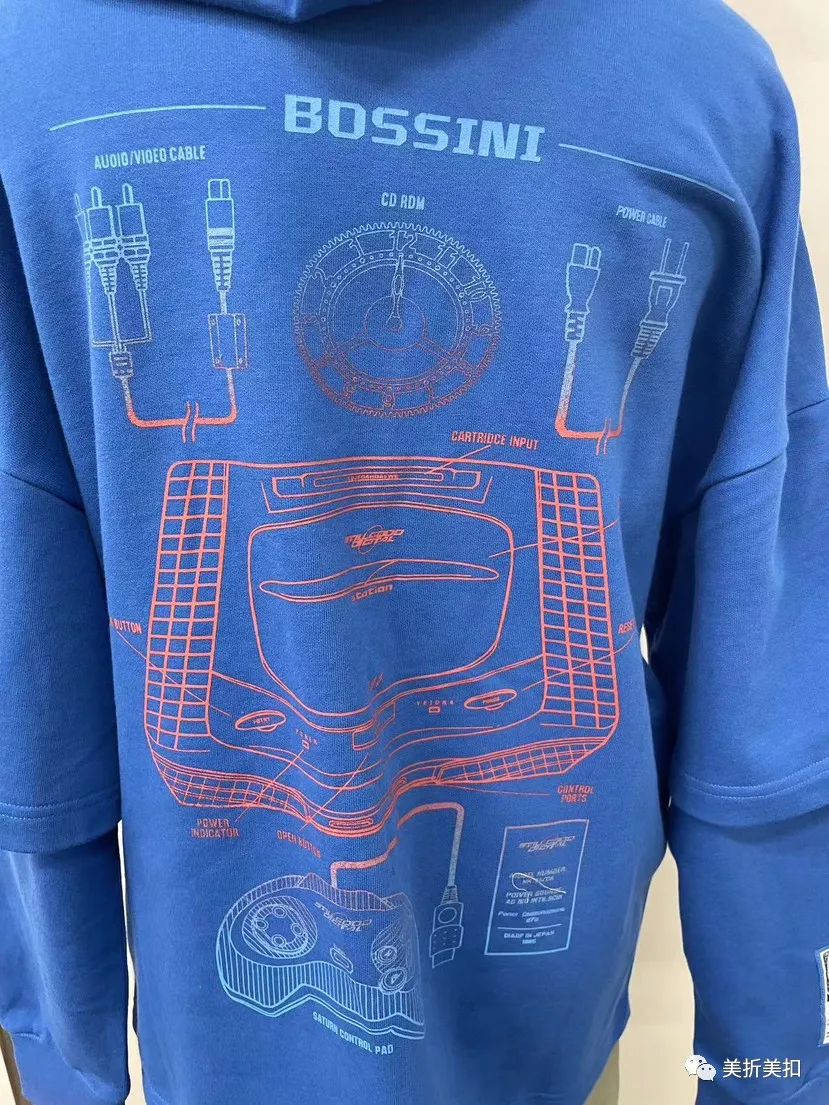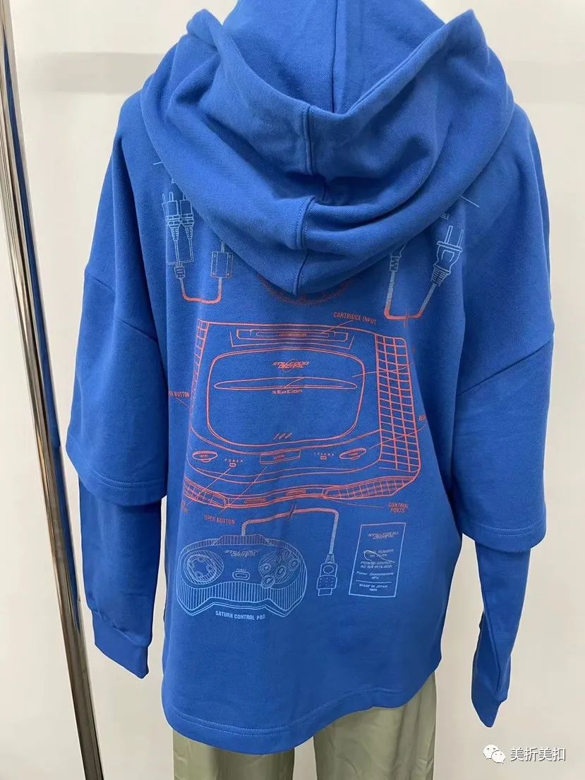 假两件设计,增加层次感,正面对称分割线设计结合渐变印花图案,背后大幅游戏元素印花图案