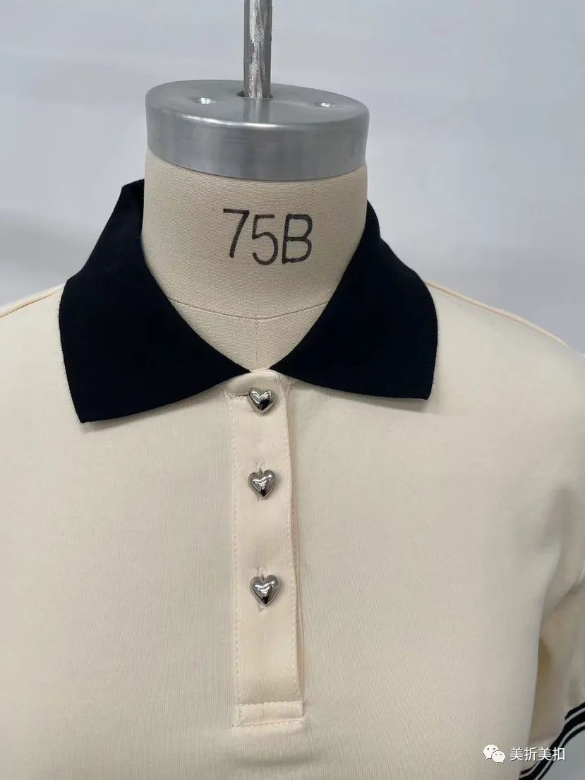 撞色翻领,领口纽扣造型为心形,袖口松紧条纹设计
