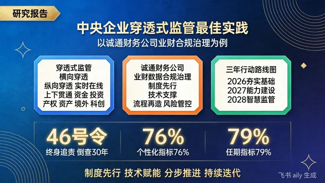 报告核心摘要:2026年1月1日,国务院国资委第46号令正式施行,标志着国资监管进入“终身追责、穿透倒查”的刚性监管新时代。本报告以诚通财务公司的业财合规治理实践为蓝本,系统解读了穿透式监管的核心政策,提炼了“制度先行、技术支撑、流程再造、风险管控”四位一体的落地方法,并构建了覆盖制度、技术、组织、文化的四维实施框架,旨在为中央企业构建自主可控的智慧监管能力提供系统性、可操作的参考路径。
