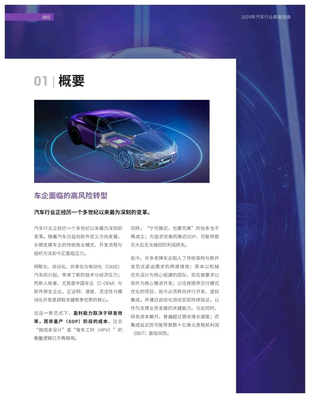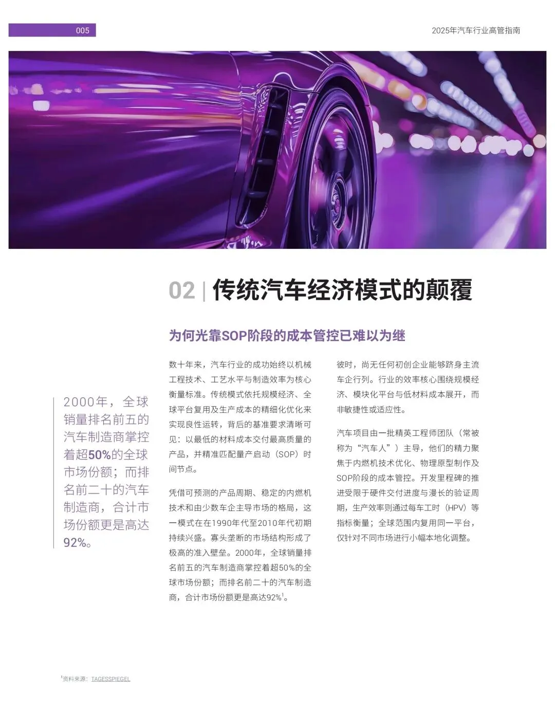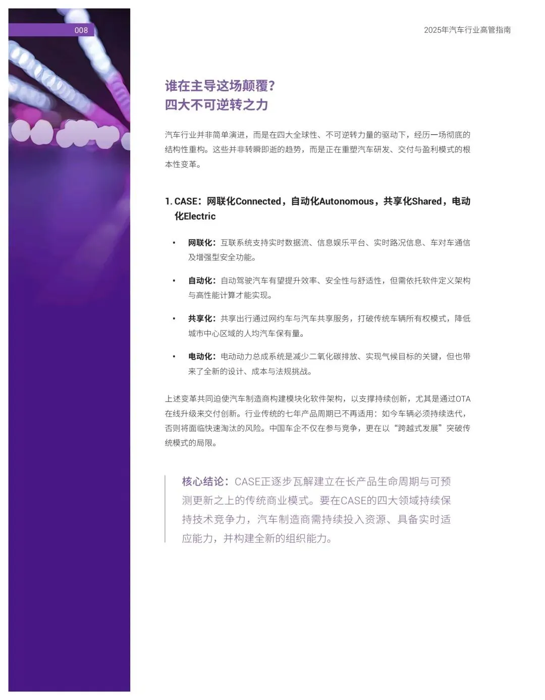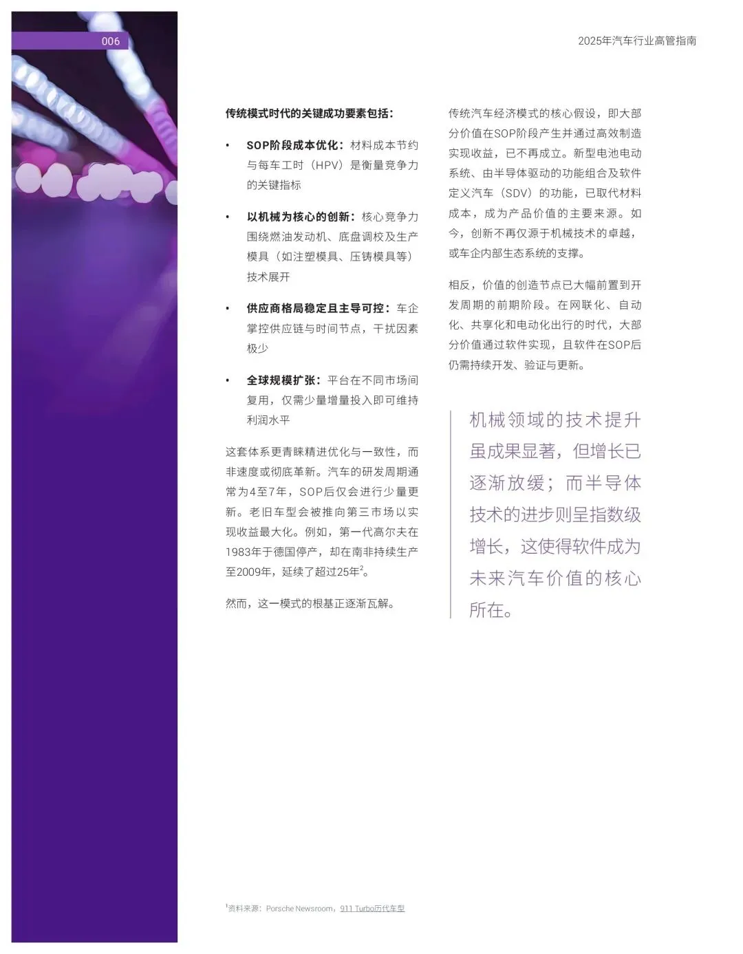 机械进步线性放缓,软件复杂度指数级增长,价值创造已大幅前置到研发早期。CASE、中国车企崛起、法规趋严、旧经济模式崩塌,四股力量把车企逼到墙角。SOP阶段的成本优化和每车工时,不再是胜负手。
