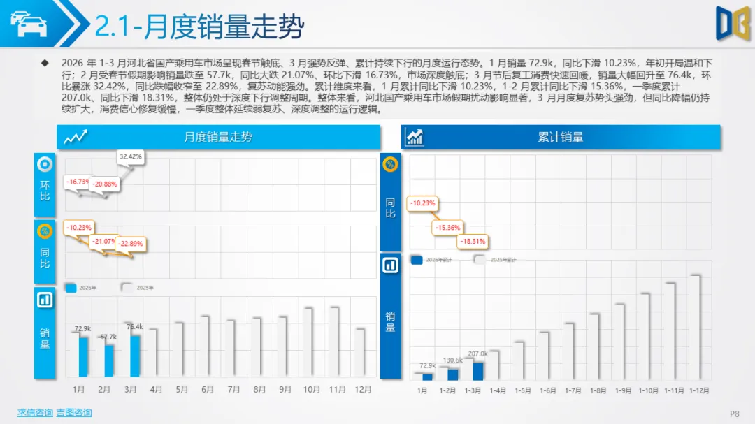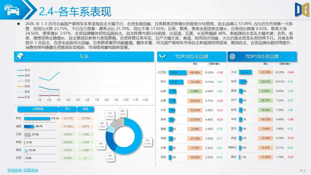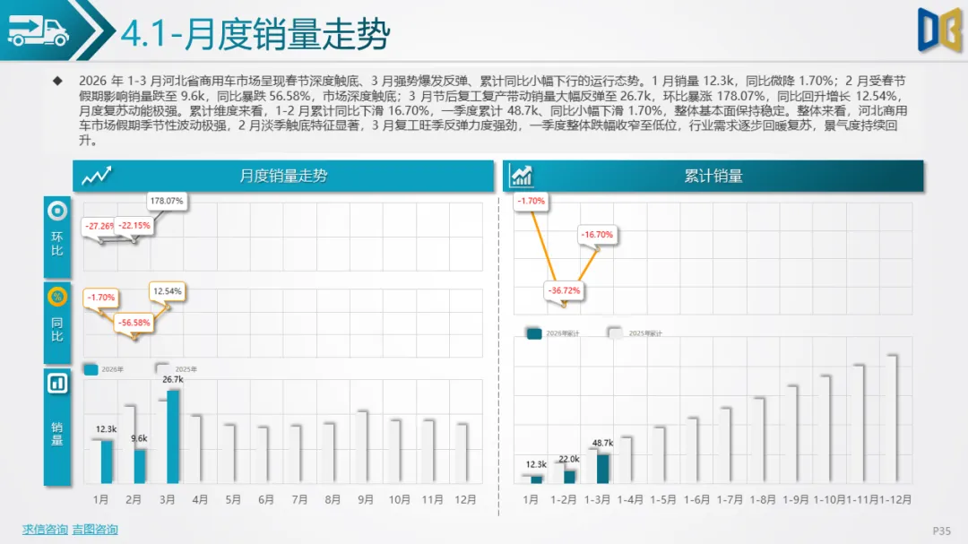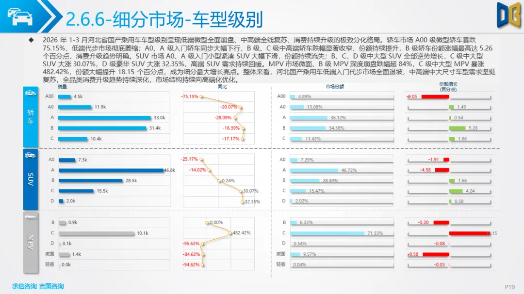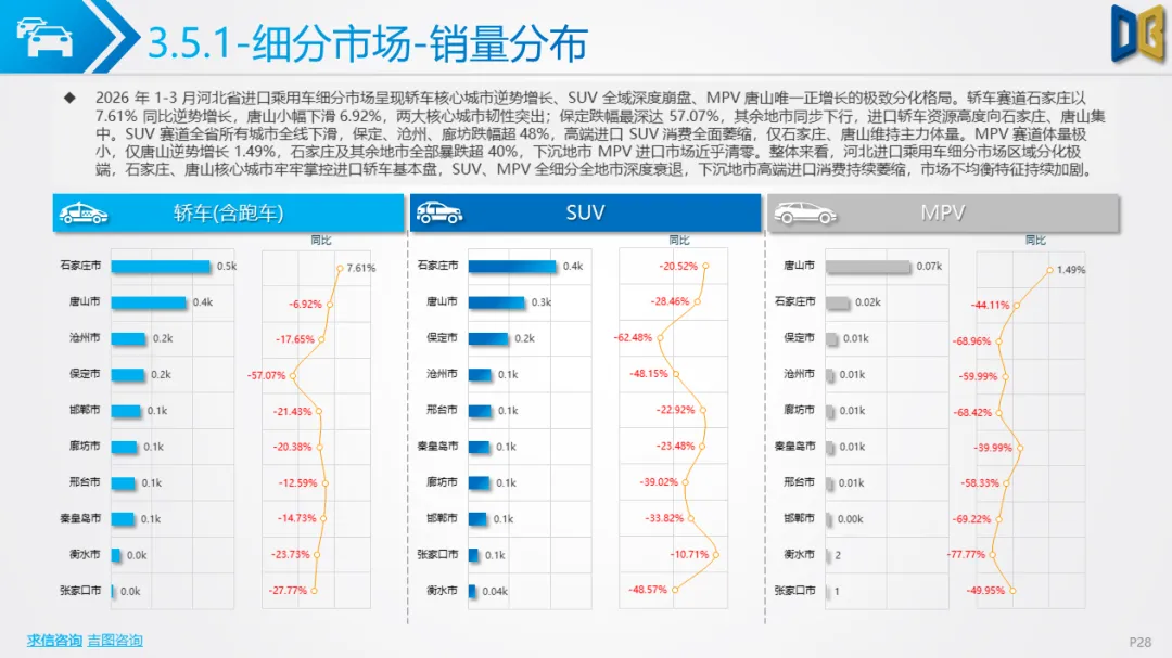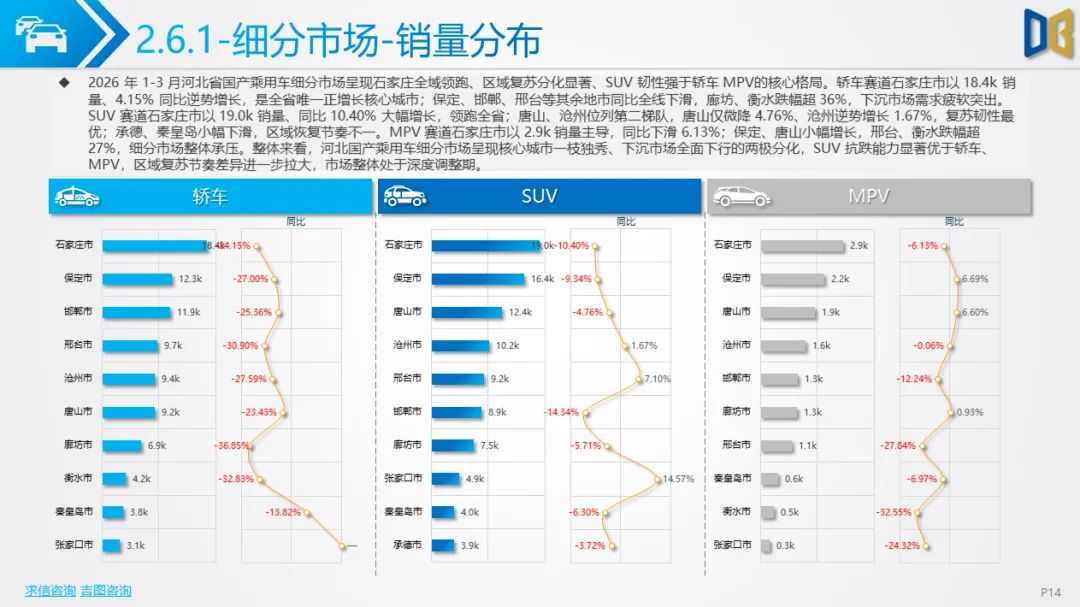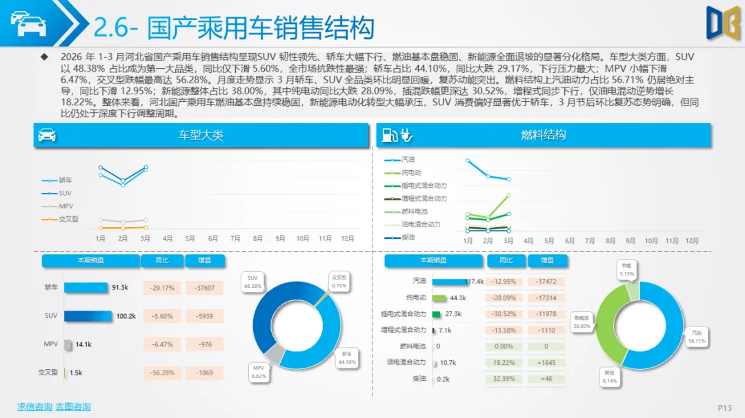 展望后续,随着消费信心逐步修复与旺季到来,3 月环比反弹趋势有望延续,轿车、SUV市场跌幅将持续收窄;商用车受益于基建与物流复苏,有望保持稳健增长;进口车仍将依赖日系豪华与2.0L燃油动力,新能源短期难以回暖;长期来看,河北汽车市场将延续 “燃油稳、新能源缓、高端升、区域聚” 的格局,电动化转型将从规模扩张转向结构优化,混动车型成为过渡主力,自主燃油与合资品牌将主导市场复苏进程。