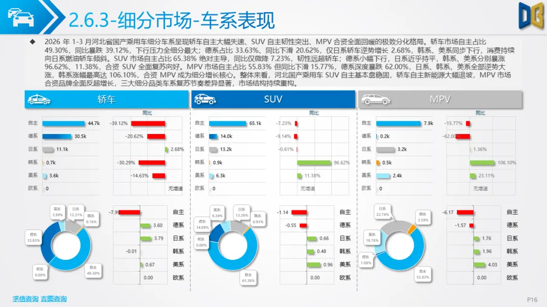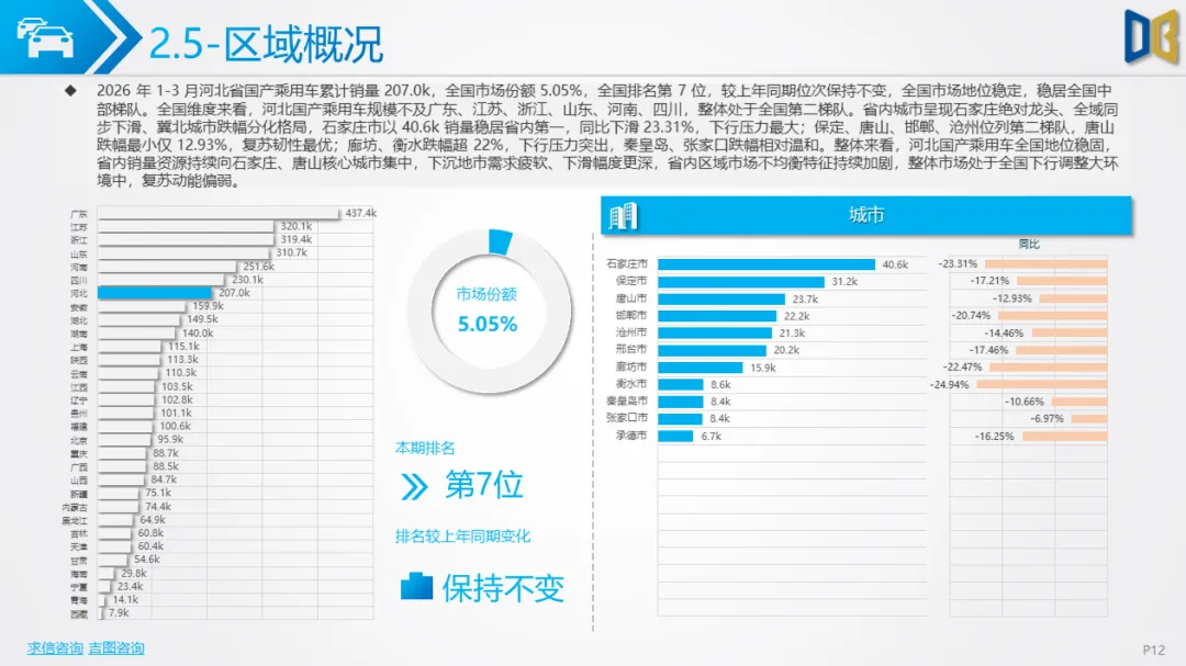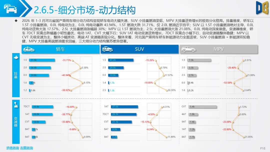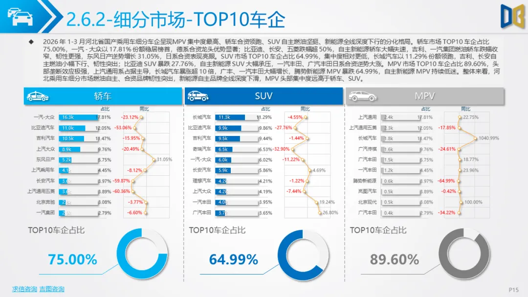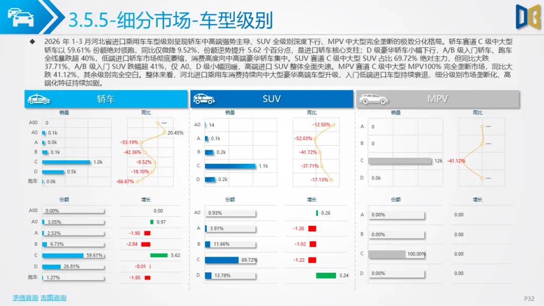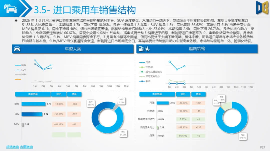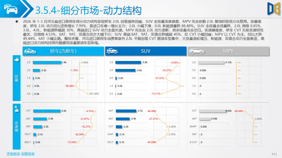 展望后续,随着消费信心逐步修复与旺季到来,3 月环比反弹趋势有望延续,轿车、SUV市场跌幅将持续收窄;商用车受益于基建与物流复苏,有望保持稳健增长;进口车仍将依赖日系豪华与2.0L燃油动力,新能源短期难以回暖;长期来看,河北汽车市场将延续 “燃油稳、新能源缓、高端升、区域聚” 的格局,电动化转型将从规模扩张转向结构优化,混动车型成为过渡主力,自主燃油与合资品牌将主导市场复苏进程。