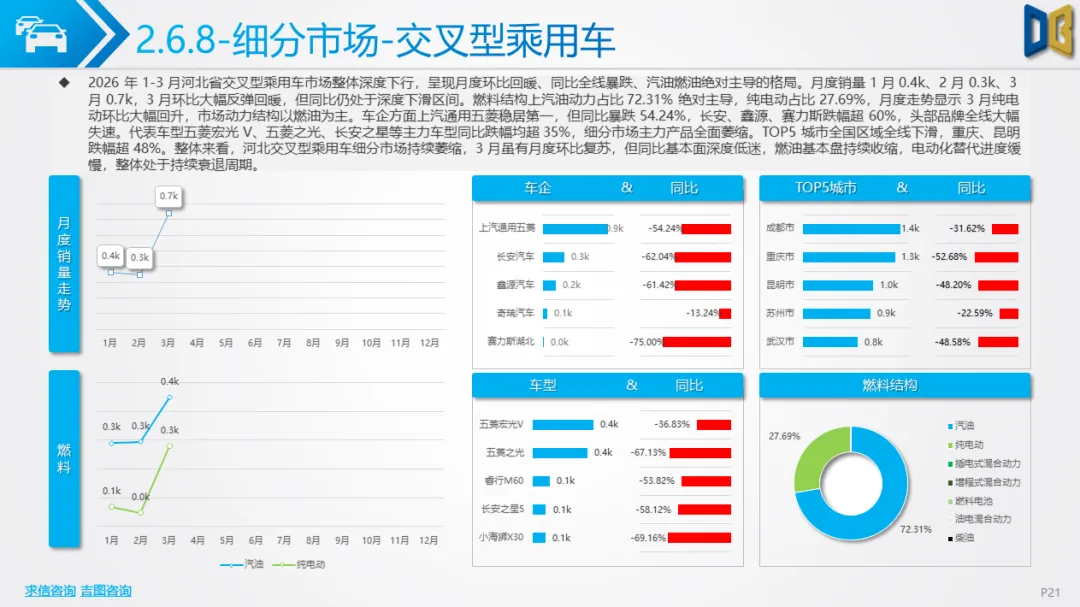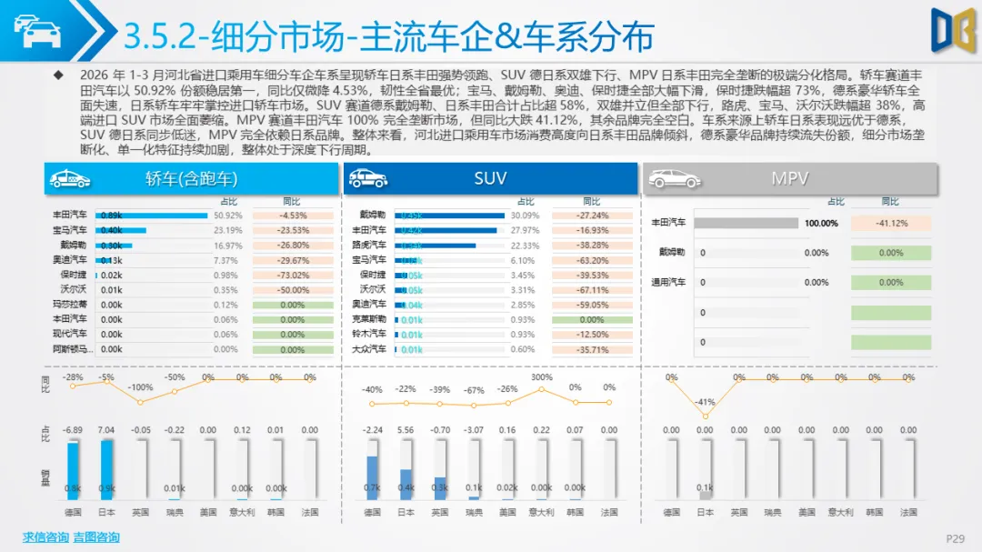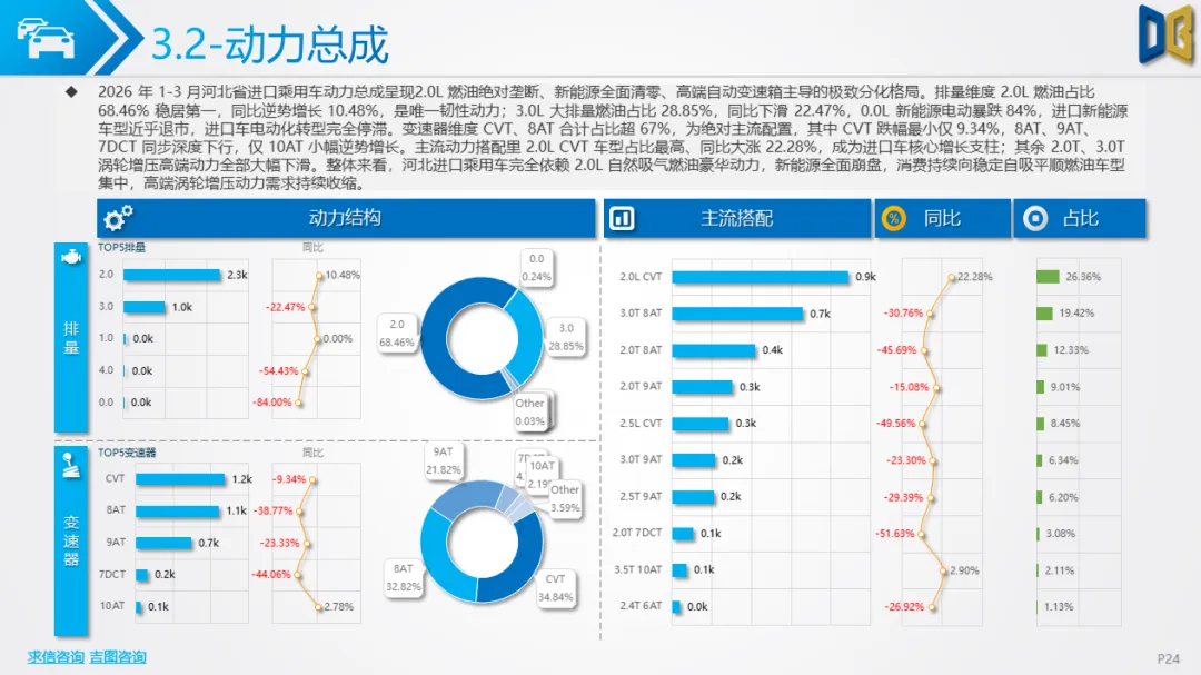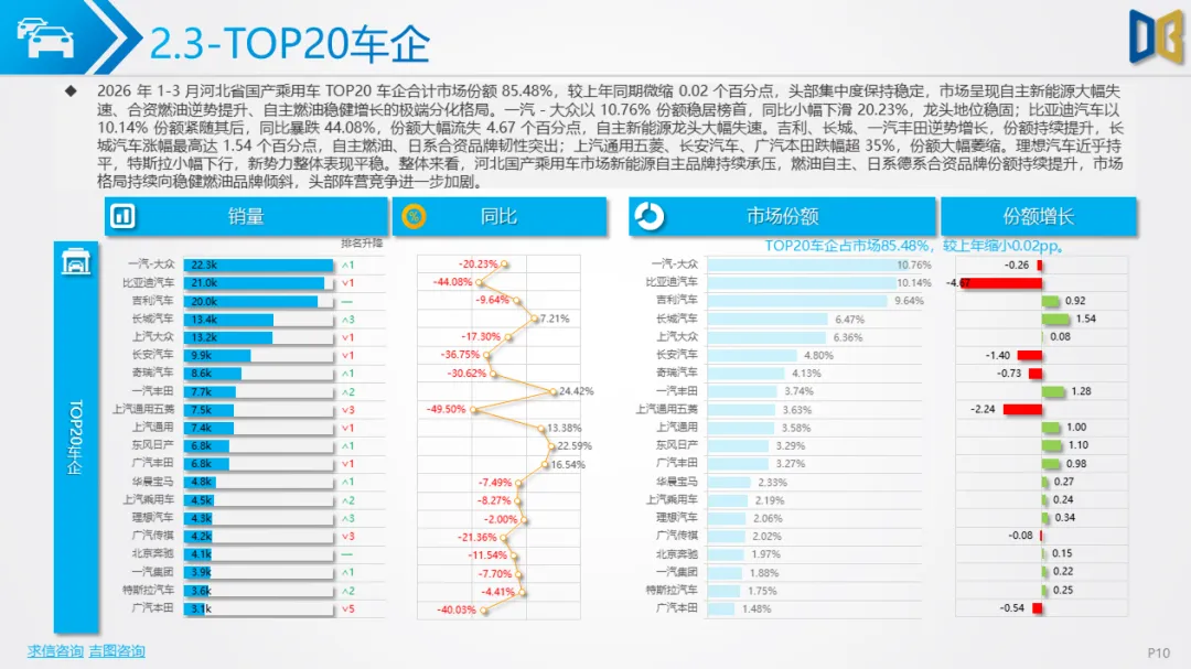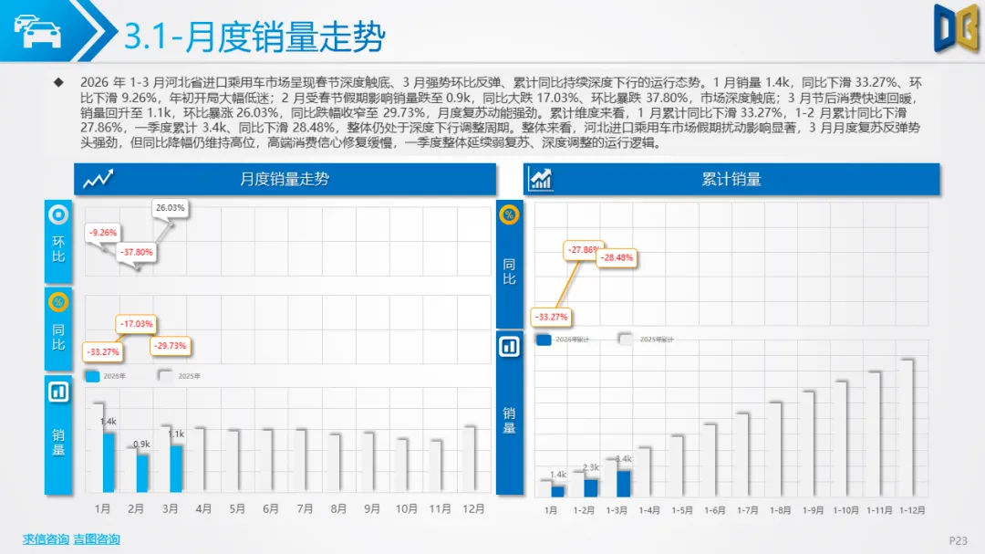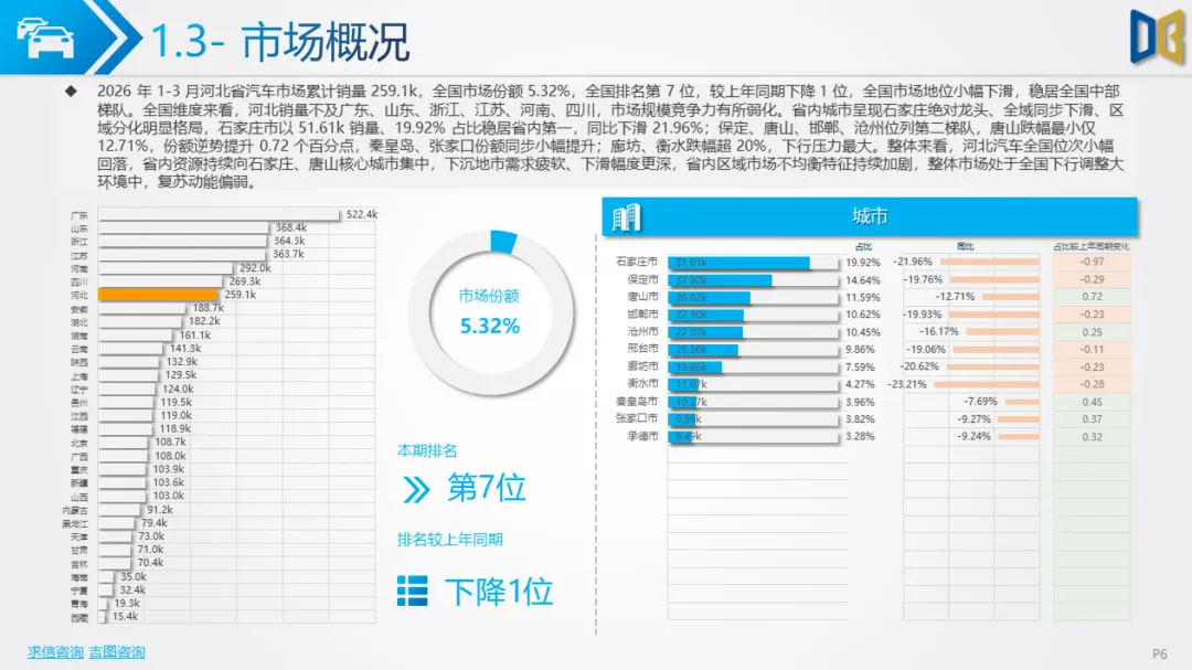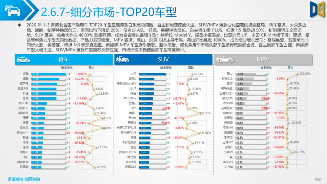 展望后续,随着消费信心逐步修复与旺季到来,3 月环比反弹趋势有望延续,轿车、SUV市场跌幅将持续收窄;商用车受益于基建与物流复苏,有望保持稳健增长;进口车仍将依赖日系豪华与2.0L燃油动力,新能源短期难以回暖;长期来看,河北汽车市场将延续 “燃油稳、新能源缓、高端升、区域聚” 的格局,电动化转型将从规模扩张转向结构优化,混动车型成为过渡主力,自主燃油与合资品牌将主导市场复苏进程。