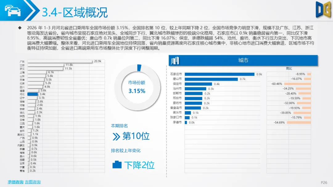 燃料结构呈现 “汽油主导、新能源退坡” 格局,汽油动力占比 51.96%,同比下滑14.80%,仍是市场基本盘;纯电动、混动新能源占比分别为17.69%、20.26%,同比分别大跌24.94%、20.03%,电动化转型短期明显承压;柴油动力占比持续收缩,仅在商用车领域保持稳定。区域层面,石家庄以19.92%占比稳居省内第一,唐山跌幅最小、份额逆势提升,廊坊、衡水等下沉地市跌幅超20%,市场资源持续向核心城市集中,区域不均衡特征加剧。