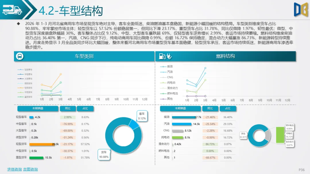 商用车一季度累计销量4.87万辆,同比仅微降1.70%,成为全市场最稳健板块,呈现春节触底、3月爆发特征,2 月销量跌至9611辆,同比大跌56.58%,3 月环比暴涨178.07%,同比转正增长12.54%,复工复产带动效应显著。车型结构以货车为主导,占比高达90.88%,轻型货车以57.52%份额居首但同比下滑23.17%,重型货车占比31.78%,同比仅微降1.97%,重载需求稳健;客车占比仅9.12%,中型、大型客车暴跌超69%,仅轻型客车逆势增长2.99%,客运市场持续低迷。燃料结构上,柴油动力占比36.40%,汽油、CNG同步下行,纯电动商用车同比微降0.99%,份额保持稳定,混合动力暴涨86.73%,新能源转型稳步推进。