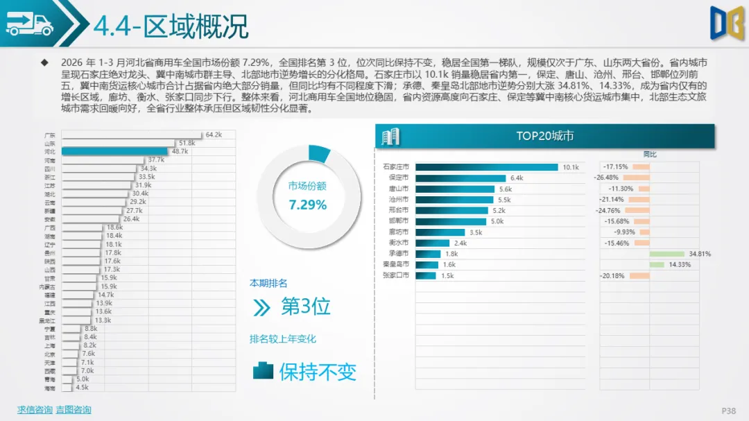 排量结构呈现 “新能源领跑轻型车、大排量柴油垄断重型车” 格局,0 排量新能源占比16.75%,主要应用于轻型客车、货车;12000ml以上大排量柴油完全垄断重型货车,重载动力需求稳固。品牌层面,北汽福田以6789辆稳居第一,上汽通用五菱、中国重汽位列二三位,远程新能源、大通等新能源品牌逆势增长,传统燃油商用车品牌普遍下滑,市场向新能源化优化。区域表现亮眼,石家庄、保定、唐山等冀中南核心城市主导市场,承德、秦皇岛北部地市逆势大涨34.81%、14.33%,成为省内唯一增长区域。