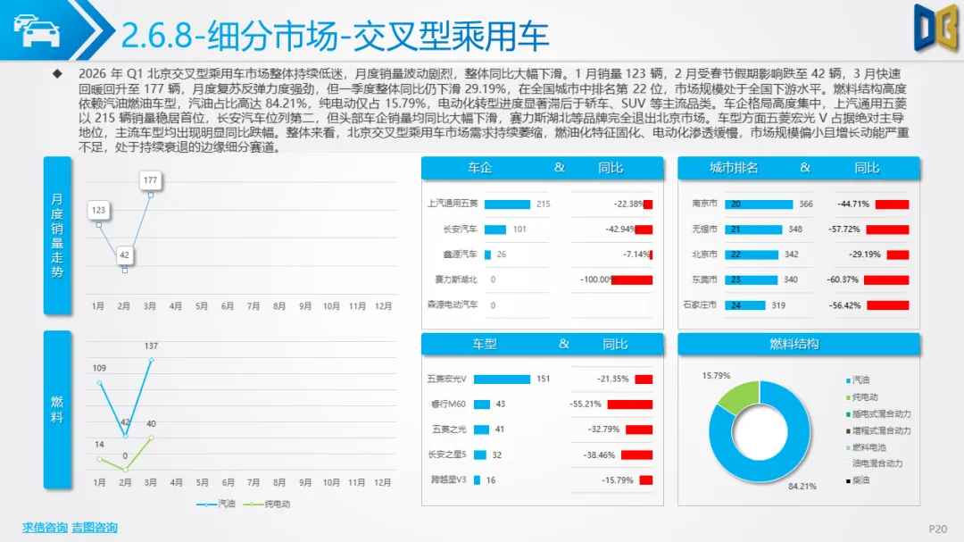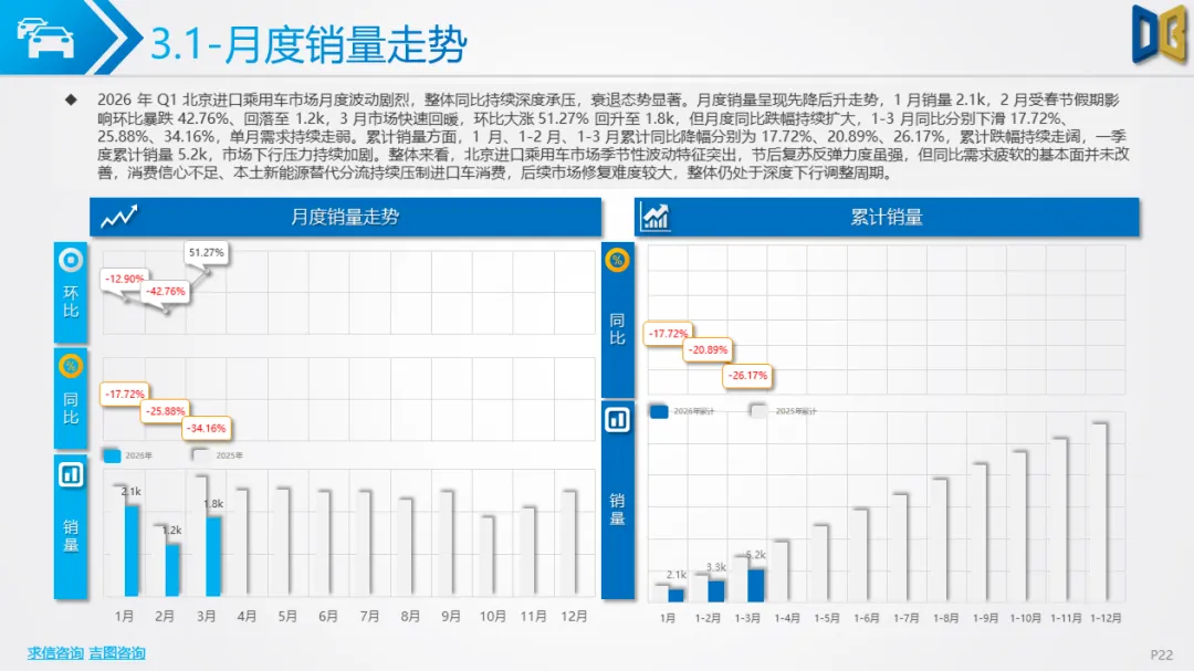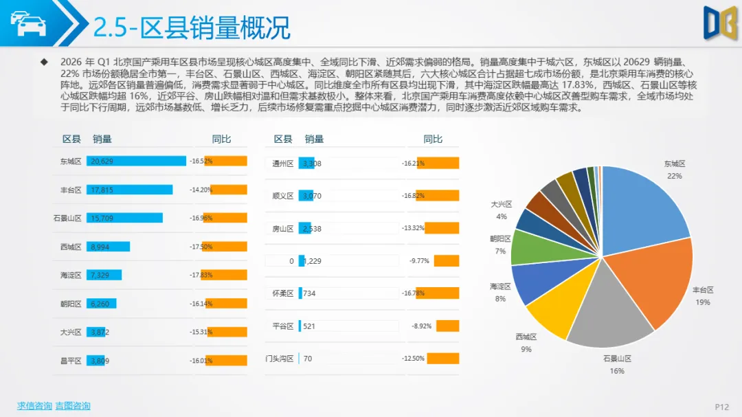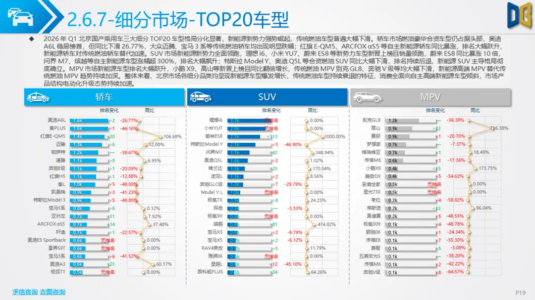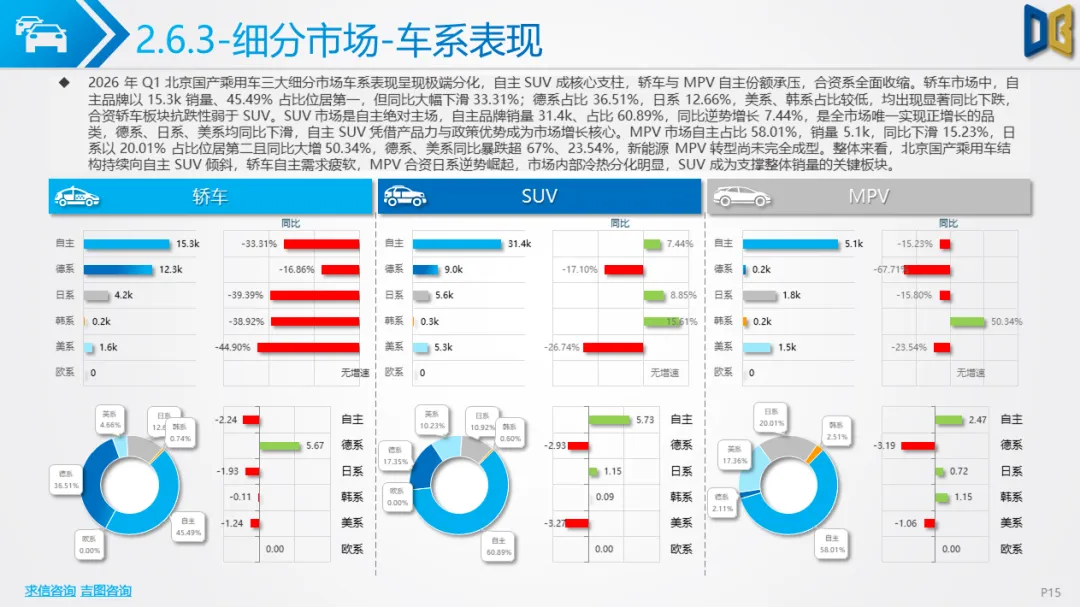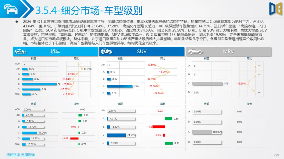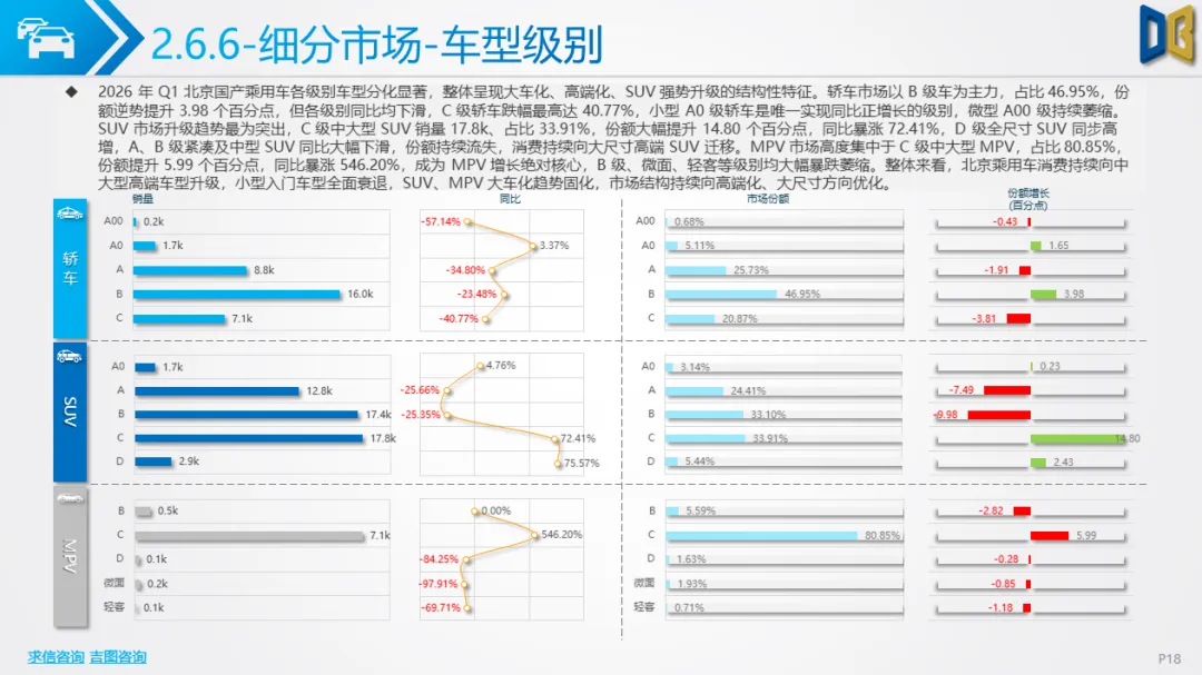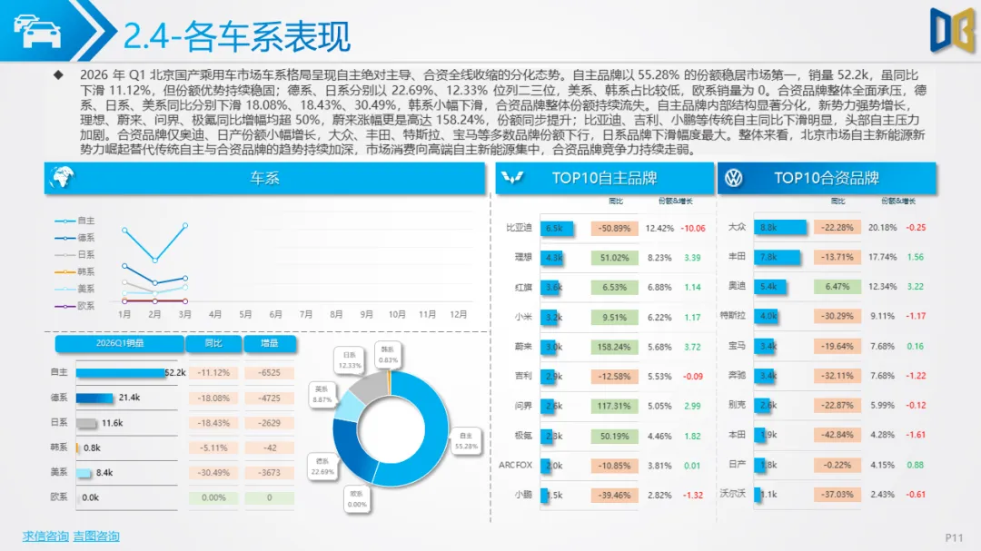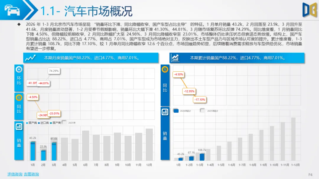 一季度北京车市呈现五大核心特征:一是总量下行但复苏明确,3 月反弹验证消费回暖,后续降幅有望持续收窄;二是新能源彻底主导,国产乘用车渗透率超51%,纯电动成为核心动力,燃油车加速退出;三是SUV化、大车化、高端化,消费偏好从轿车转向大尺寸SUV/MPV,自主高端新势力快速替代合资与进口;四是国产强、进口弱,国产产品力与价格优势凸显,进口车因电动化滞后持续承压;五是商用车结构性复苏,城区短途新能源商用车增长,长途重卡与客运持续低迷。