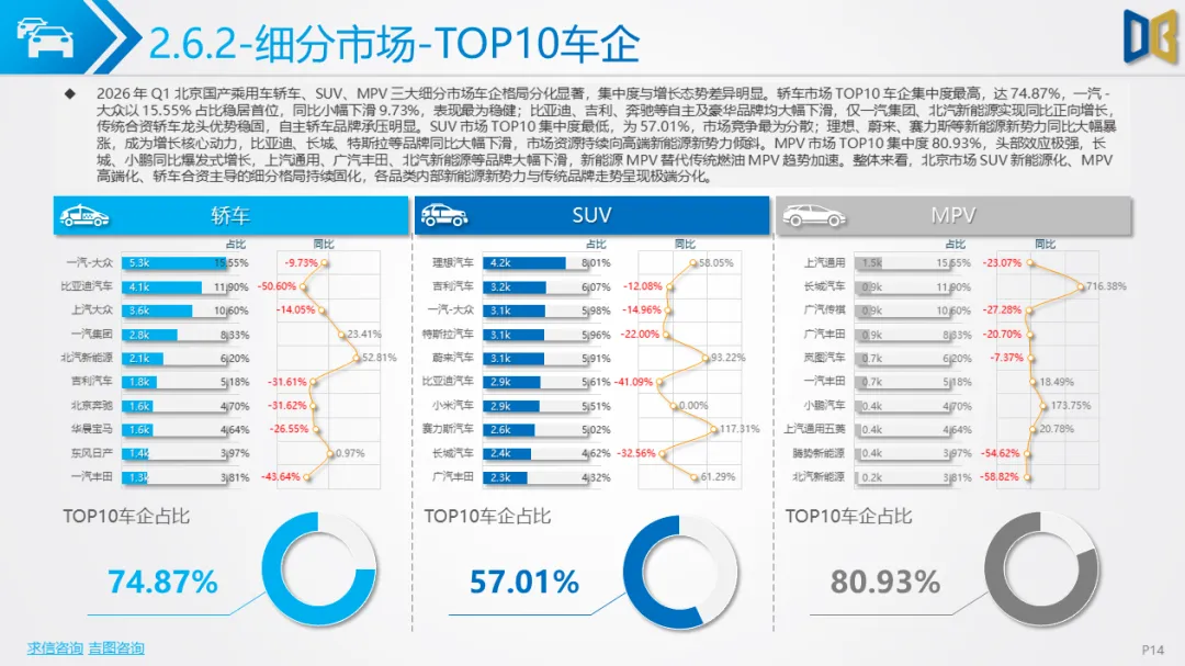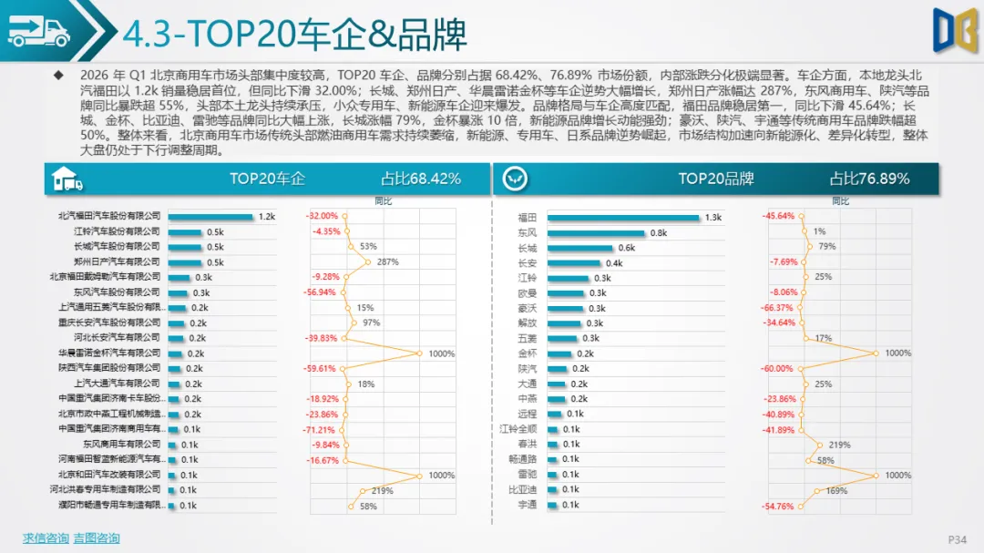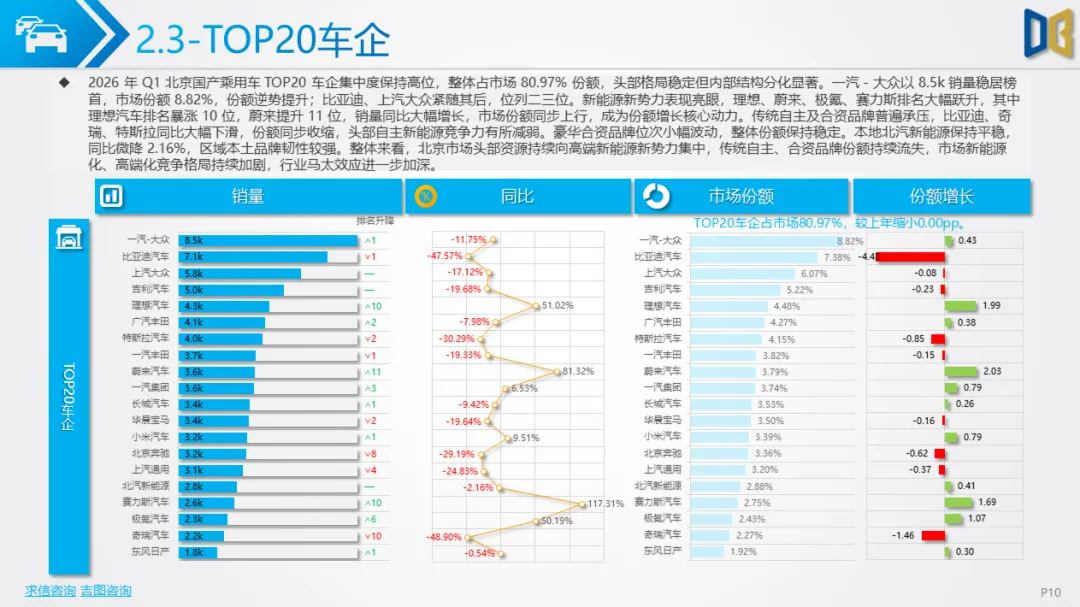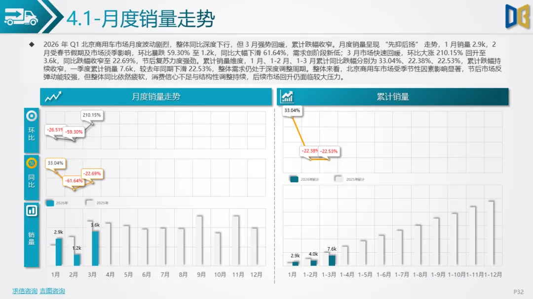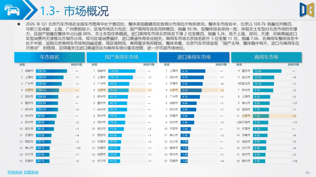 长期趋势判断:北京作为一线城市,政策与消费理念领先,新能源渗透率将持续提升,2026年全年有望突破60%;自主新势力将进一步抢占合资与进口份额,高端市场由 “进口豪华” 转向 “自主智能电动”;商用车向纯电动、专用化、城区场景集中,远郊传统燃油商用车持续萎缩;整体车市将告别高速增长,进入结构优化、存量竞争的新阶段,电动化、智能化、高端化成为唯一增长主线。