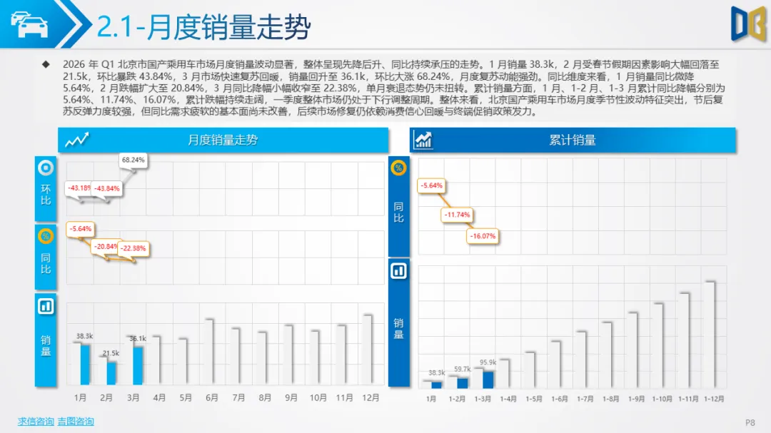 一季度北京汽车市场月度走势呈现典型 “V型” 复苏,1月销量43.2k辆,同比下降4.50%;2 月受春节假期影响跌至23.9k辆,环比下滑44.81%,同比跌幅扩大至24.98%;3 月快速反弹至41.6k辆,环比大涨74.29%,同比降幅收窄至23.01%。累计方面,1-3月总销量108.7k辆,同比下降17.10%,较 1 月降幅显著收窄,市场回暖信号明确。