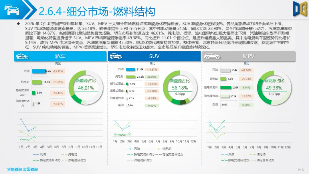 车型结构方面,SUV以50.84%的占比成为第一大品类,销量55.3k辆,同比仅下滑4.62%,韧性最强;轿车占比33.58%,销量36.5k辆,同比大跌29.54%,衰退显著;MPV、交叉型、货车、客车占比较小且普遍下滑。燃料结构上,新能源渗透率突破54%,其中纯电动占33.91%,混动占20.28%,汽油车型占比降至42.86%,新能源正式超越燃油成为北京车市核心动力,替代趋势不可逆。