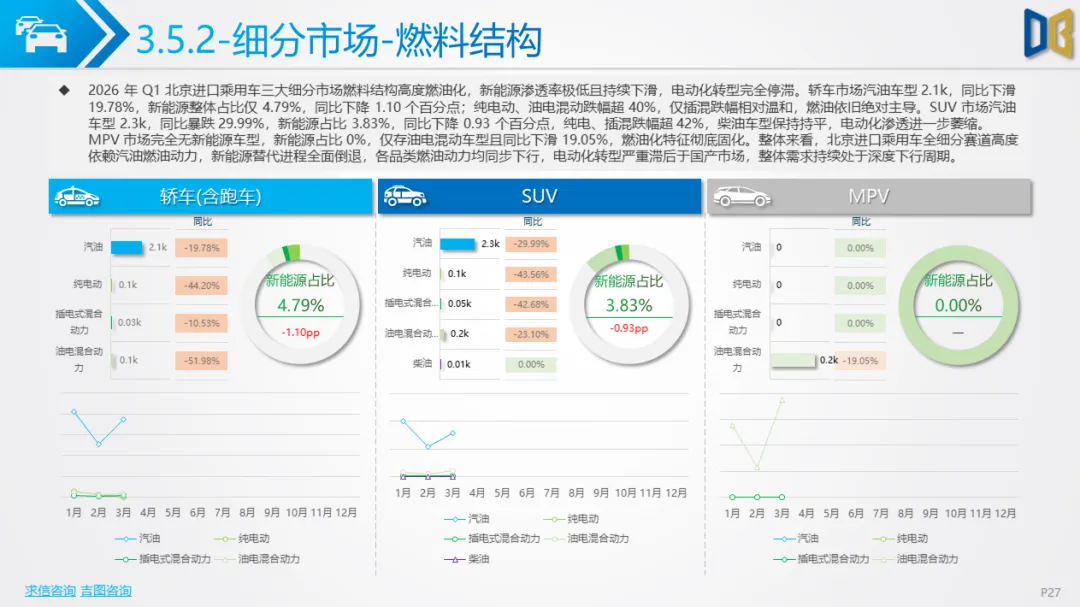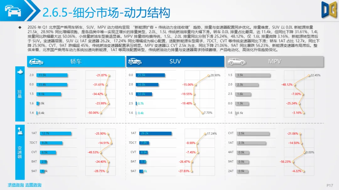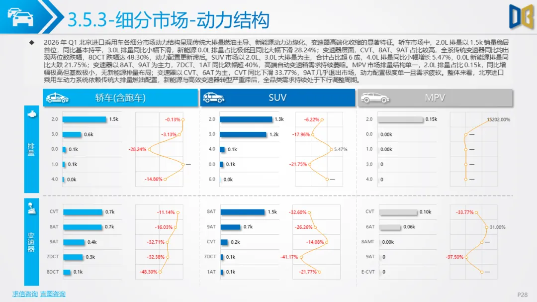 国产乘用车是北京市场的压舱石,一季度销量95.9k辆,同比下降16.07%,月度同样呈现1月稳、2 月弱、3 月强的走势。动力总成全面向新能源切换,0.0L新能源排量占比35.73%,1AT新能源变速器占比42.98%,均为市场第一,且同比降幅远小于燃油动力;2.0L、1.5L燃油排量及7DCT、CVT等传统变速器全线大幅下滑,0.0L+1AT成为最主流动力组合,电动化转型彻底完成。