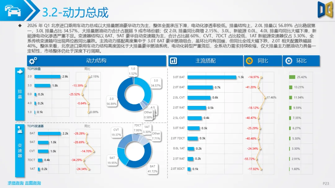 进口乘用车市场持续深度低迷,一季度销量5.2k辆,同比下降26.17%,月度跌幅持续扩大,3 月反弹无力。动力结构高度依赖大排量燃油,2.0L、3.0L排量占比超90%,8AT、9AT变速器为主流,新能源0.0L排量与1AT变速器占比不足5%,电动化转型几乎停滞,远落后于国产市场。