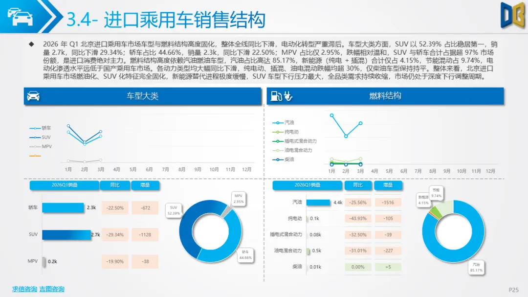 品牌格局由德日系垄断,德系占比54.78%,日系25.85%,但均同比下滑;日系抗跌性显著优于德系,雷克萨斯、丰田表现稳健,德系奥迪、保时捷、沃尔沃跌幅超40%。车型结构以SUV(52.39%)和轿车(44.66%)为主,MPV占比不足3%,汽油车型占比85.17%,新能源占比仅4.15%,全品类燃油动力下滑,新能源无增长动能。